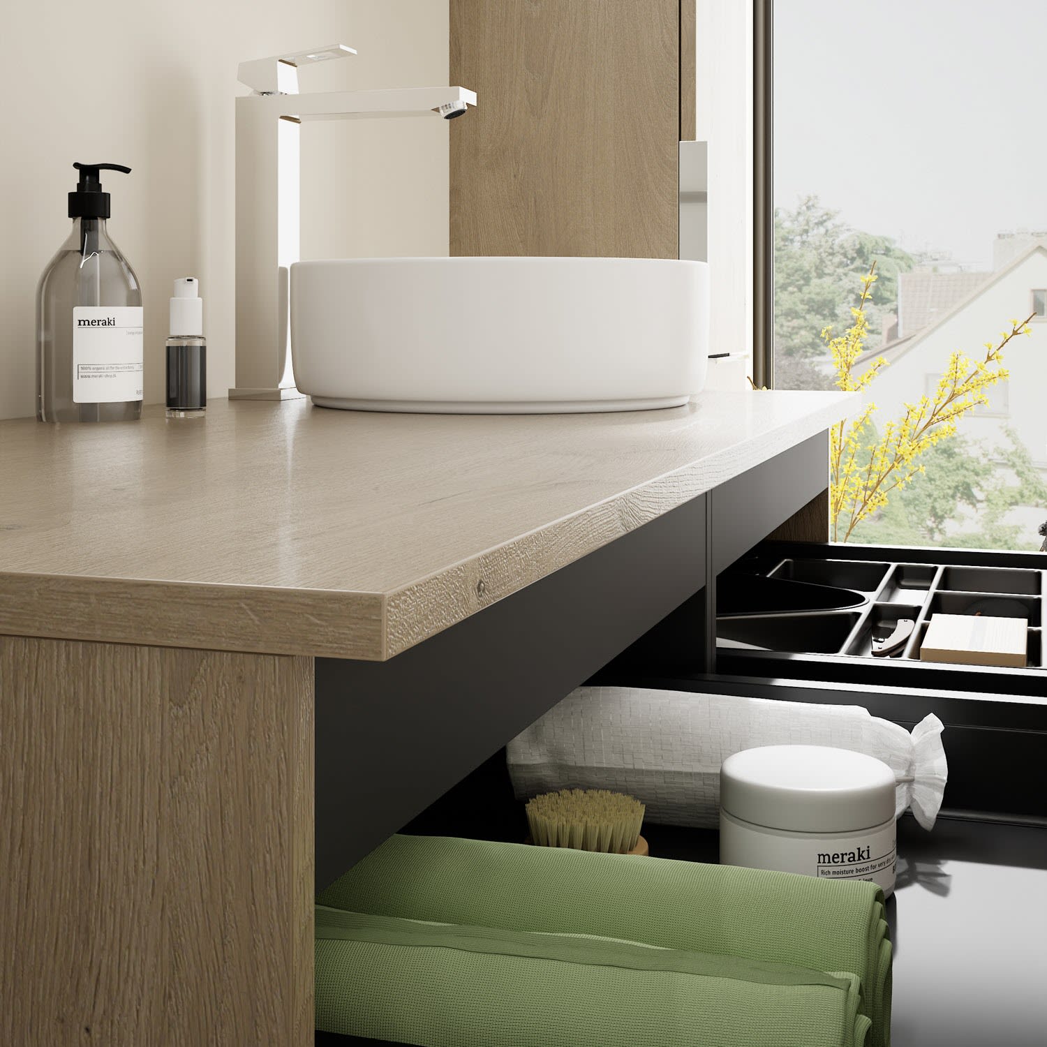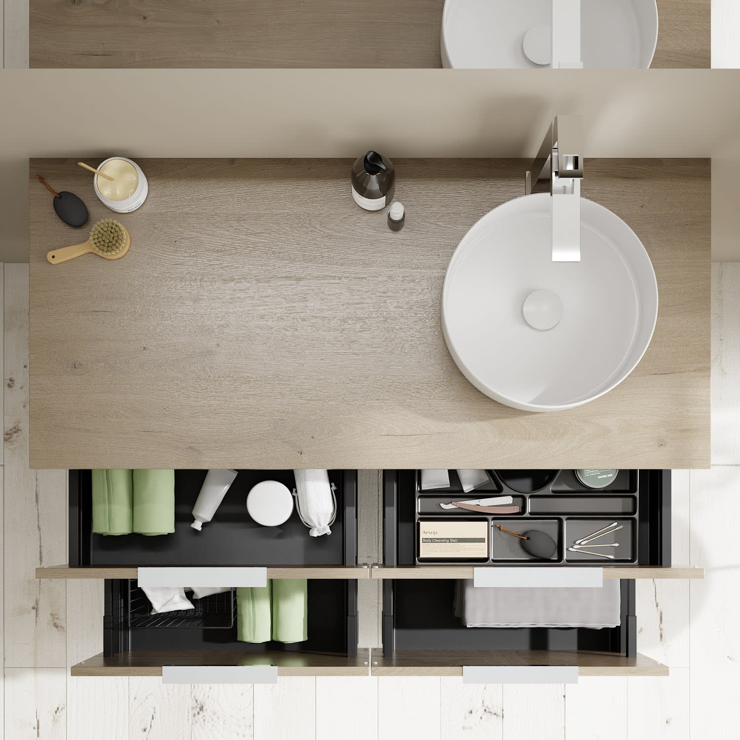 - 2 Schubladen oben, 35 cm tief, mit Siphonausschnitt und Inneneinteilung