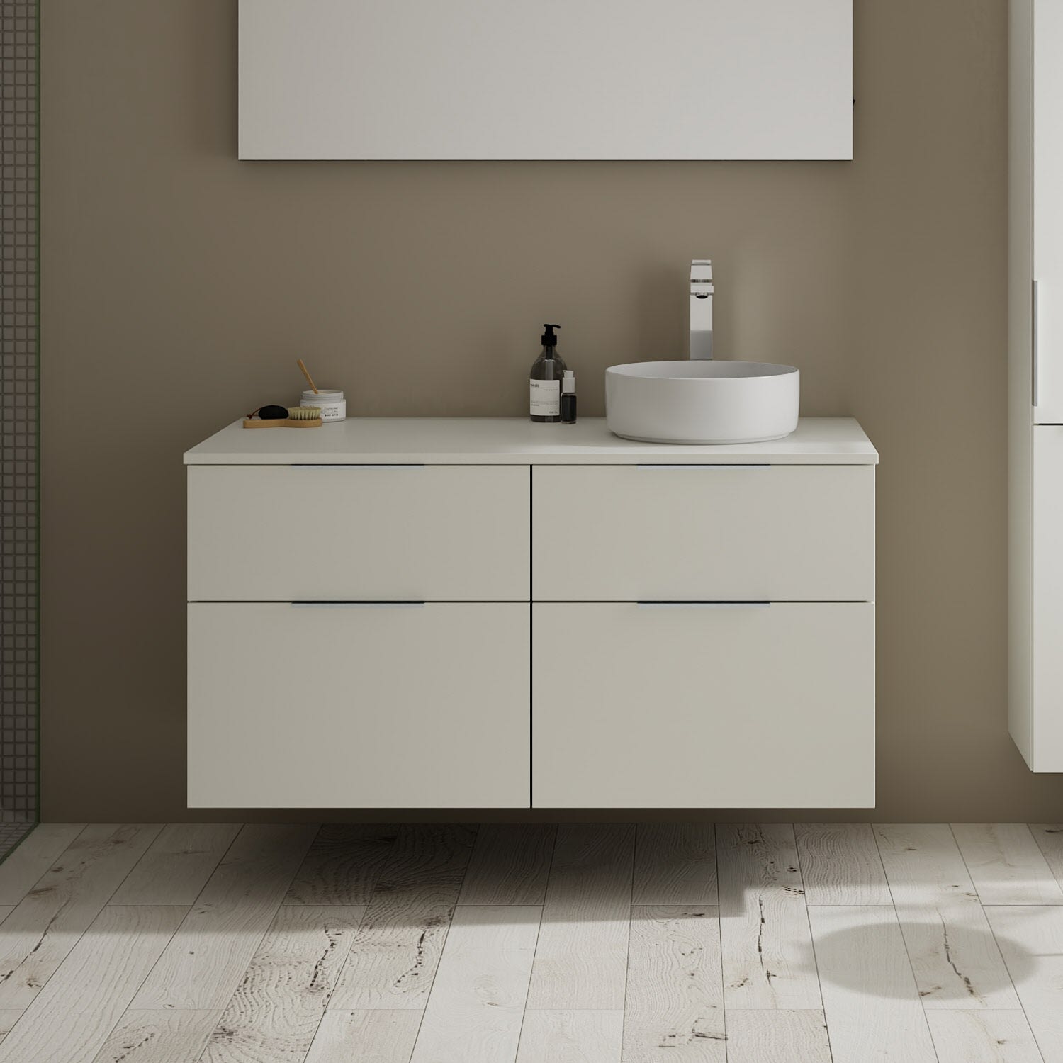 Aufsatzwaschtische müssen immer, mindestens 3 cm von den Außenkanten der Konsolenplatte entfernt sein.