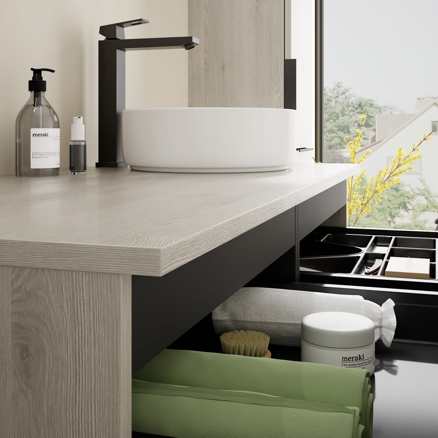 - 2 Schubladen oben, 35 cm tief, mit Siphonausschnitt und Inneneinteilung