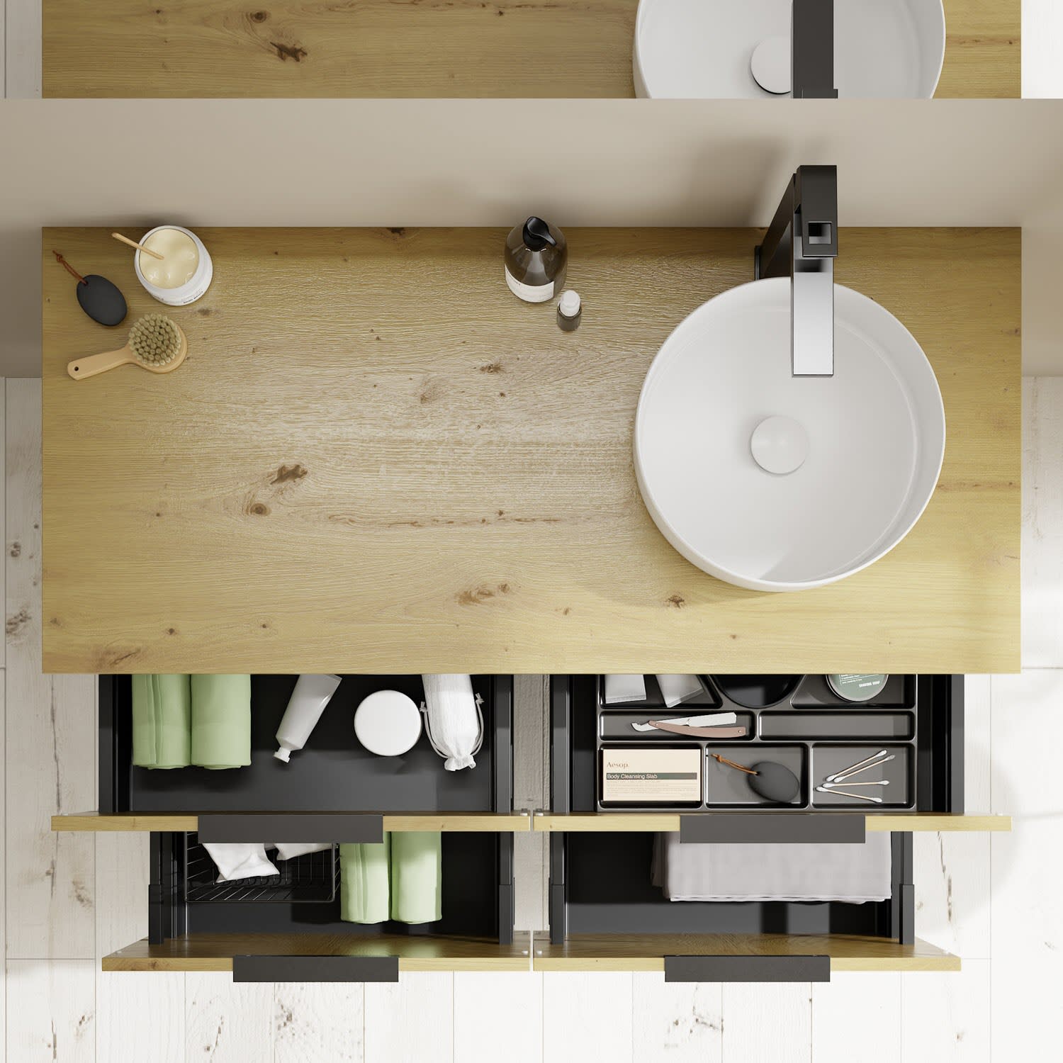 - 2 Schubladen oben, 35 cm tief, mit Siphonausschnitt und Inneneinteilung