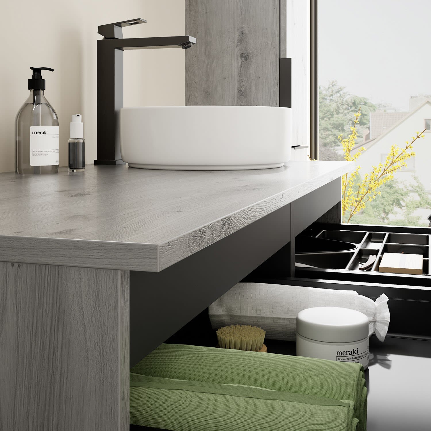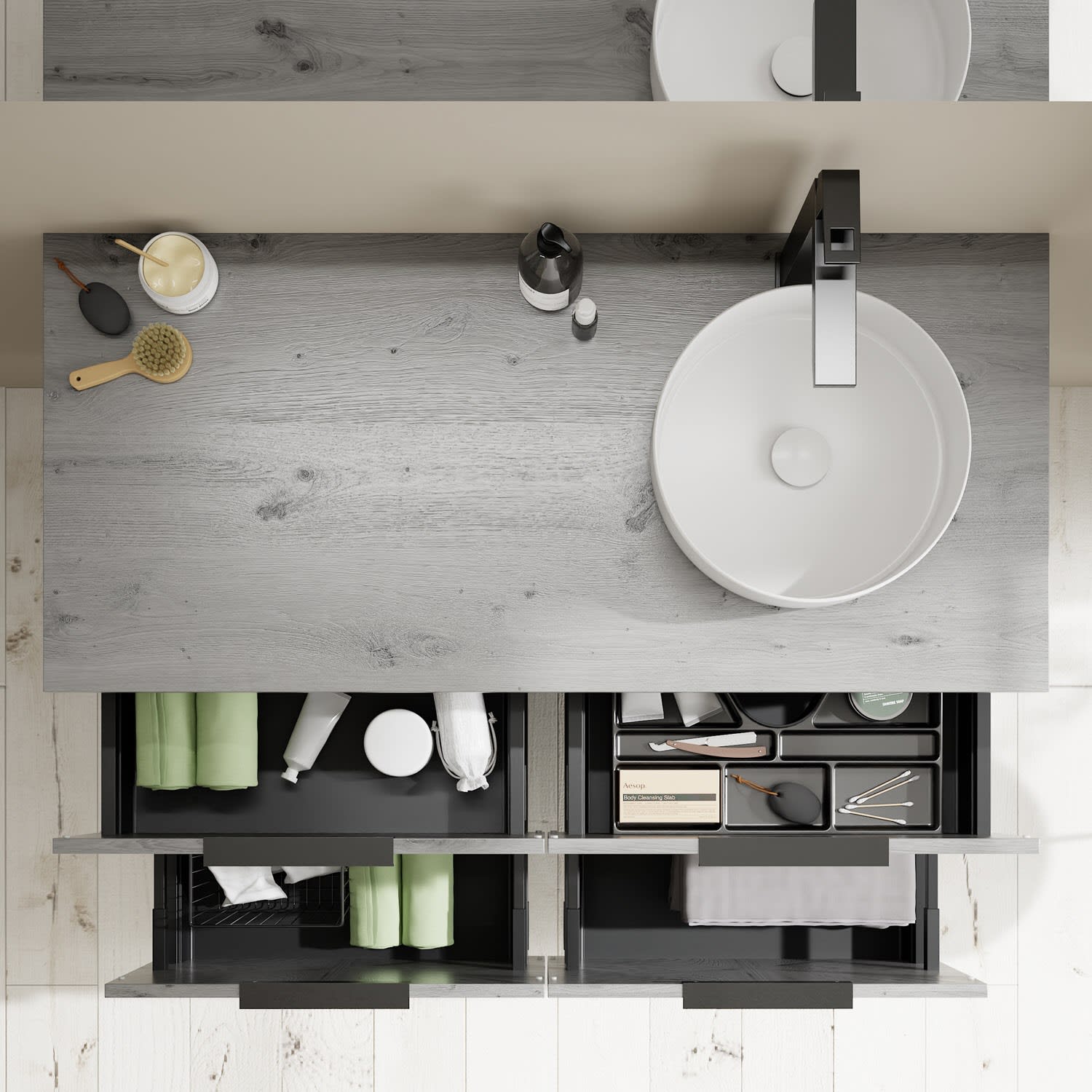 - 2 Schubladen oben, 35 cm tief, mit Siphonausschnitt und Inneneinteilung