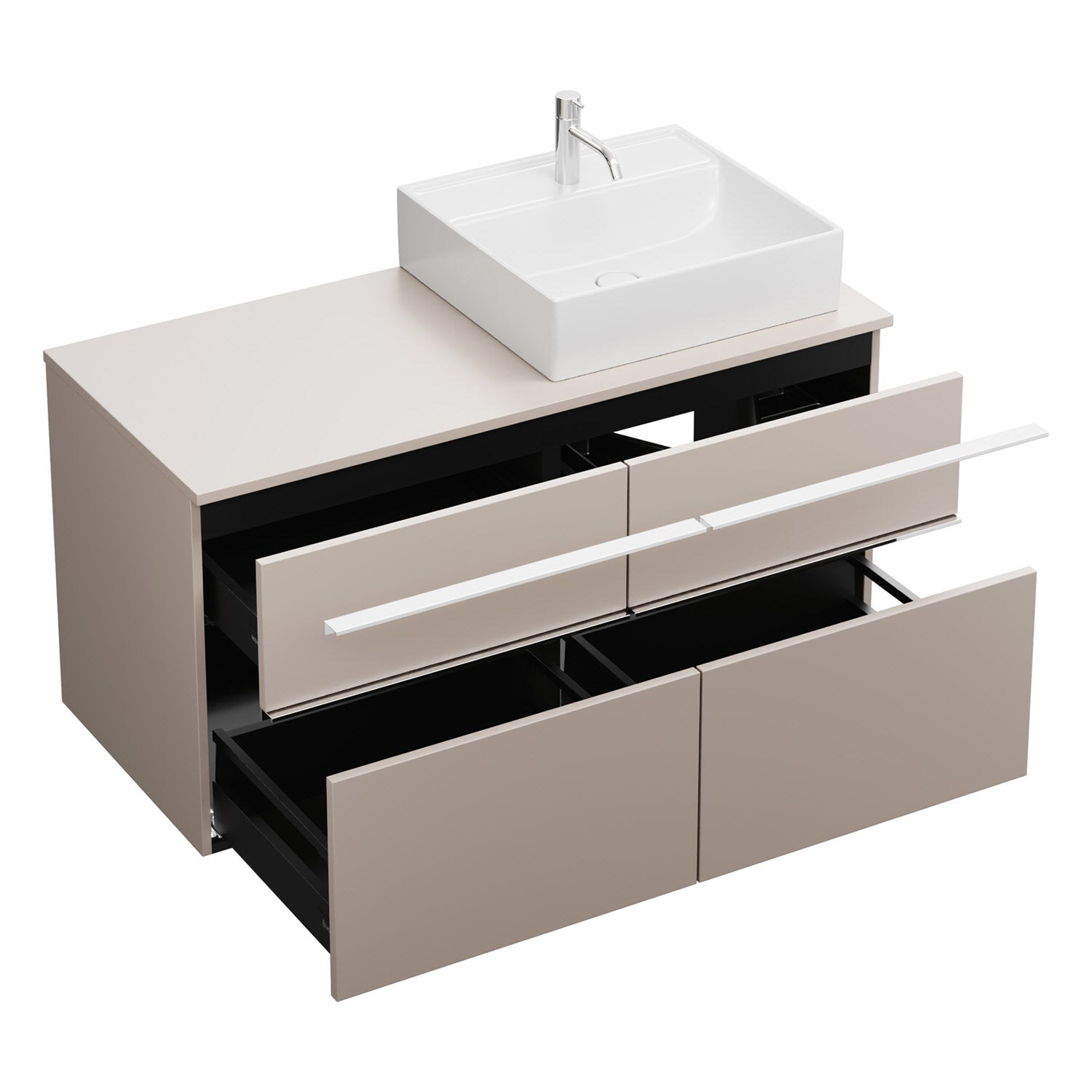 - 2 Schubladen oben, 35 cm tief, mit Siphonausschnitt und Inneneinteilung
