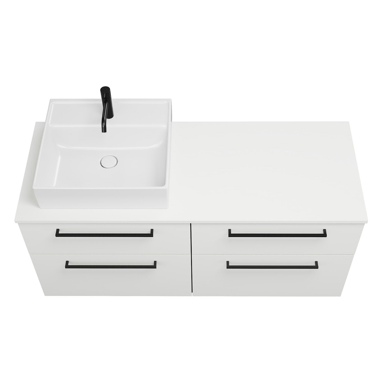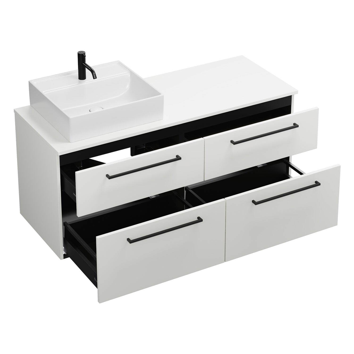 - 2 Schubladen oben, 35 cm tief, mit Siphonausschnitt und Inneneinteilung