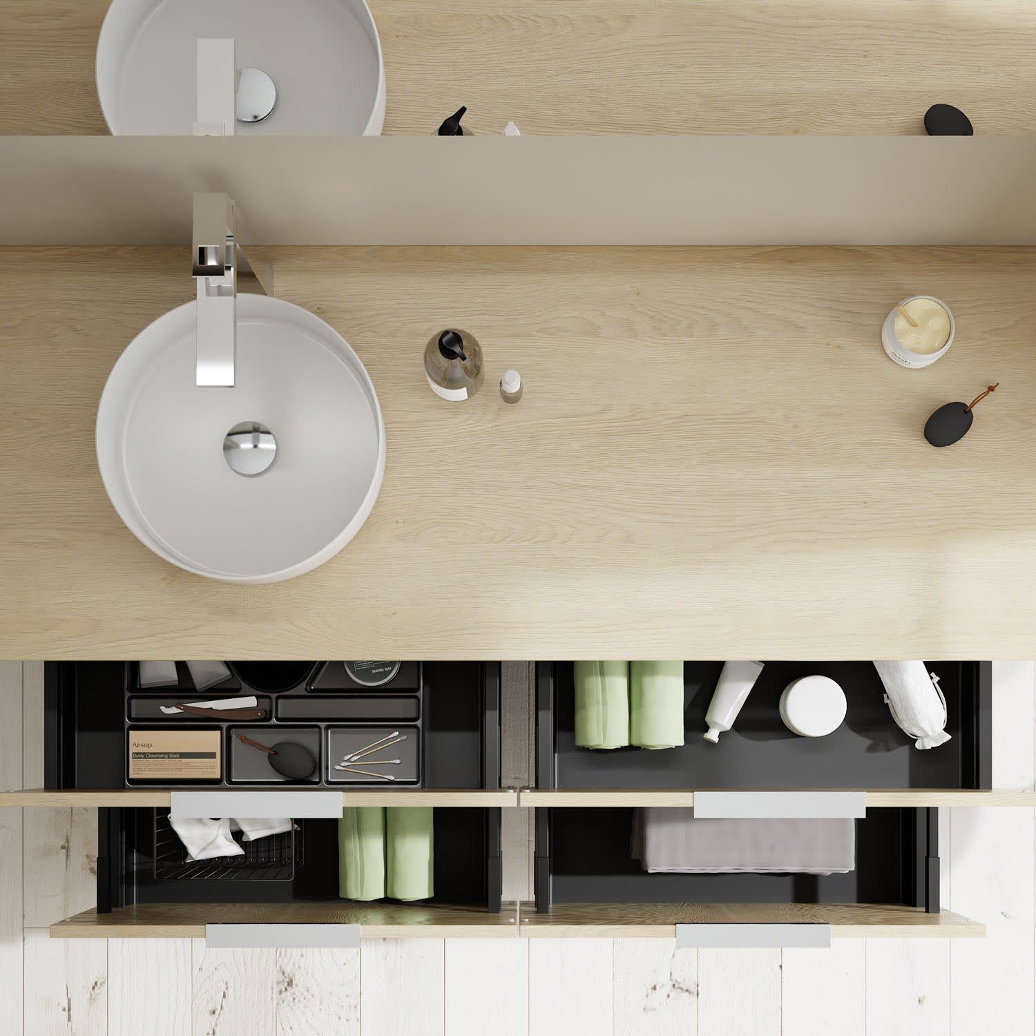 - 2 Schubladen oben, 35 cm tief, mit Siphonausschnitt und Inneneinteilung