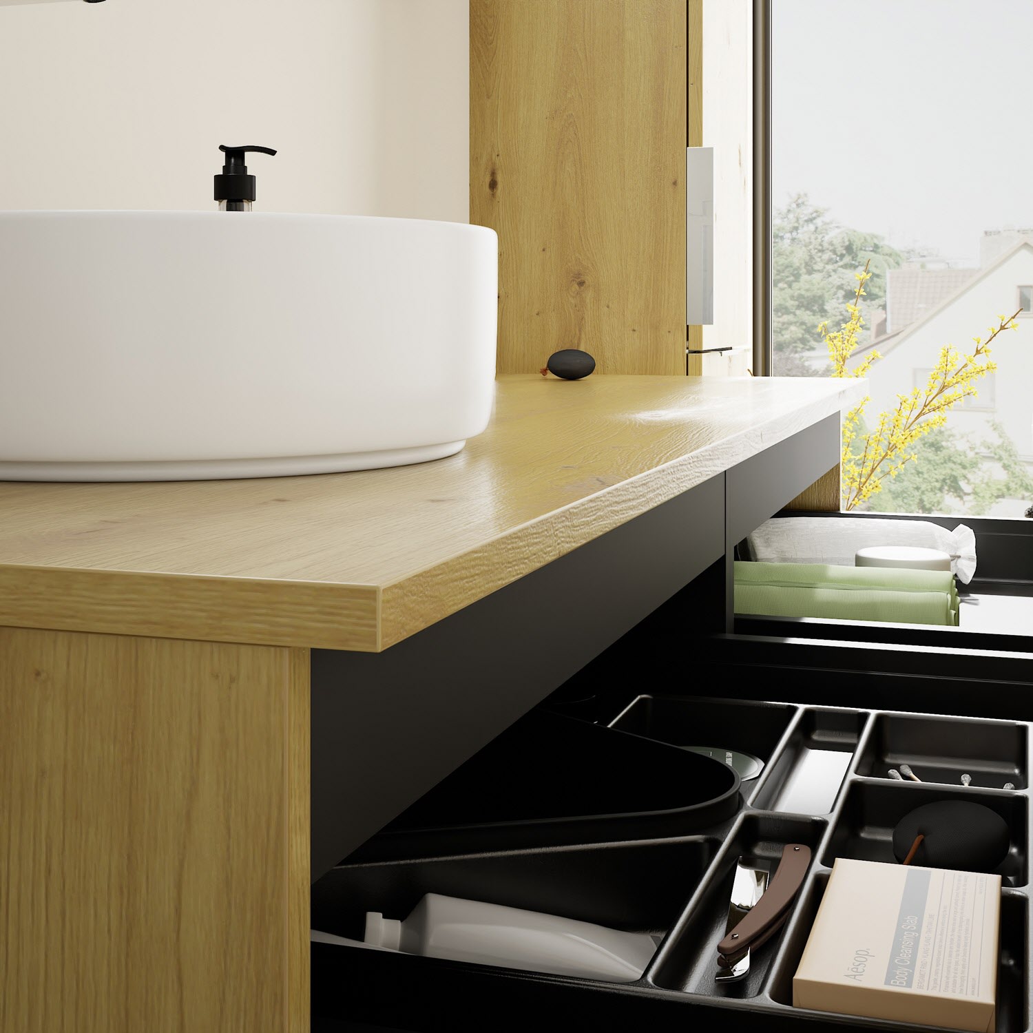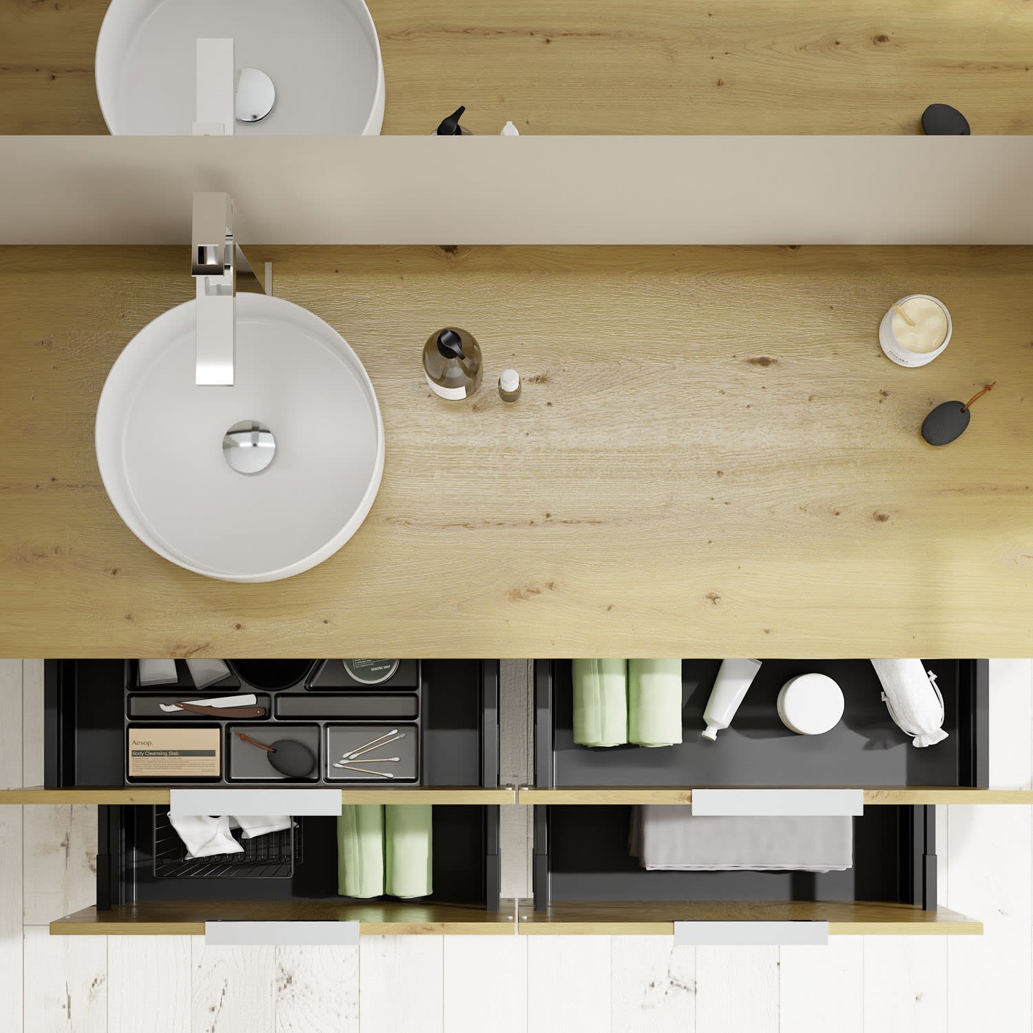 - 2 Schubladen oben, 35 cm tief, mit Siphonausschnitt und Inneneinteilung