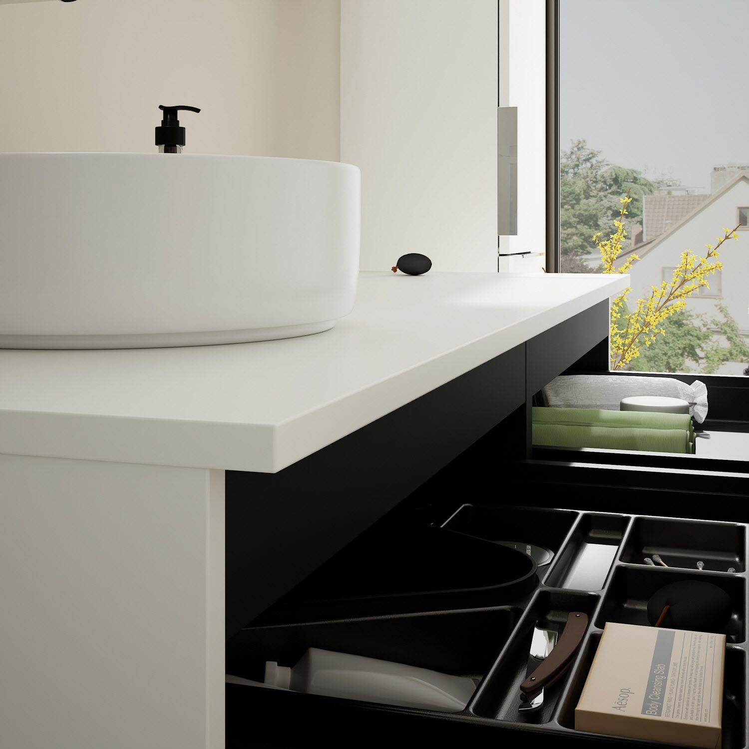- 2 Schubladen oben, 35 cm tief, mit Siphonausschnitt und Inneneinteilung