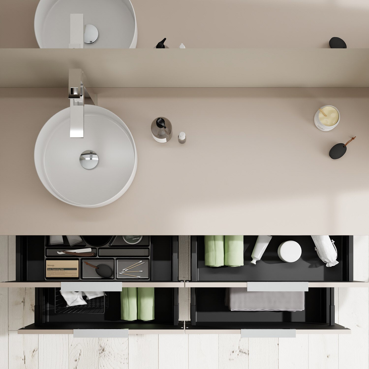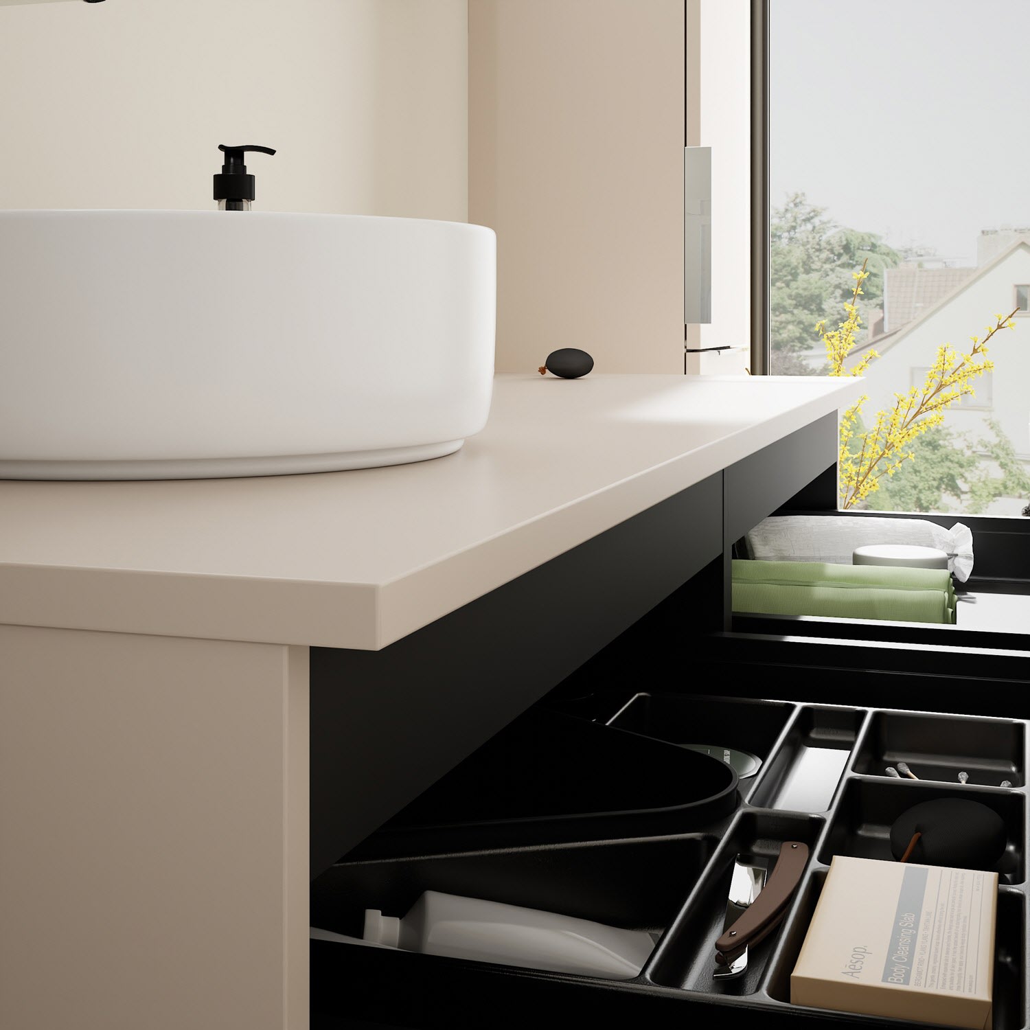 - 2 Schubladen oben, 35 cm tief, mit Siphonausschnitt und Inneneinteilung