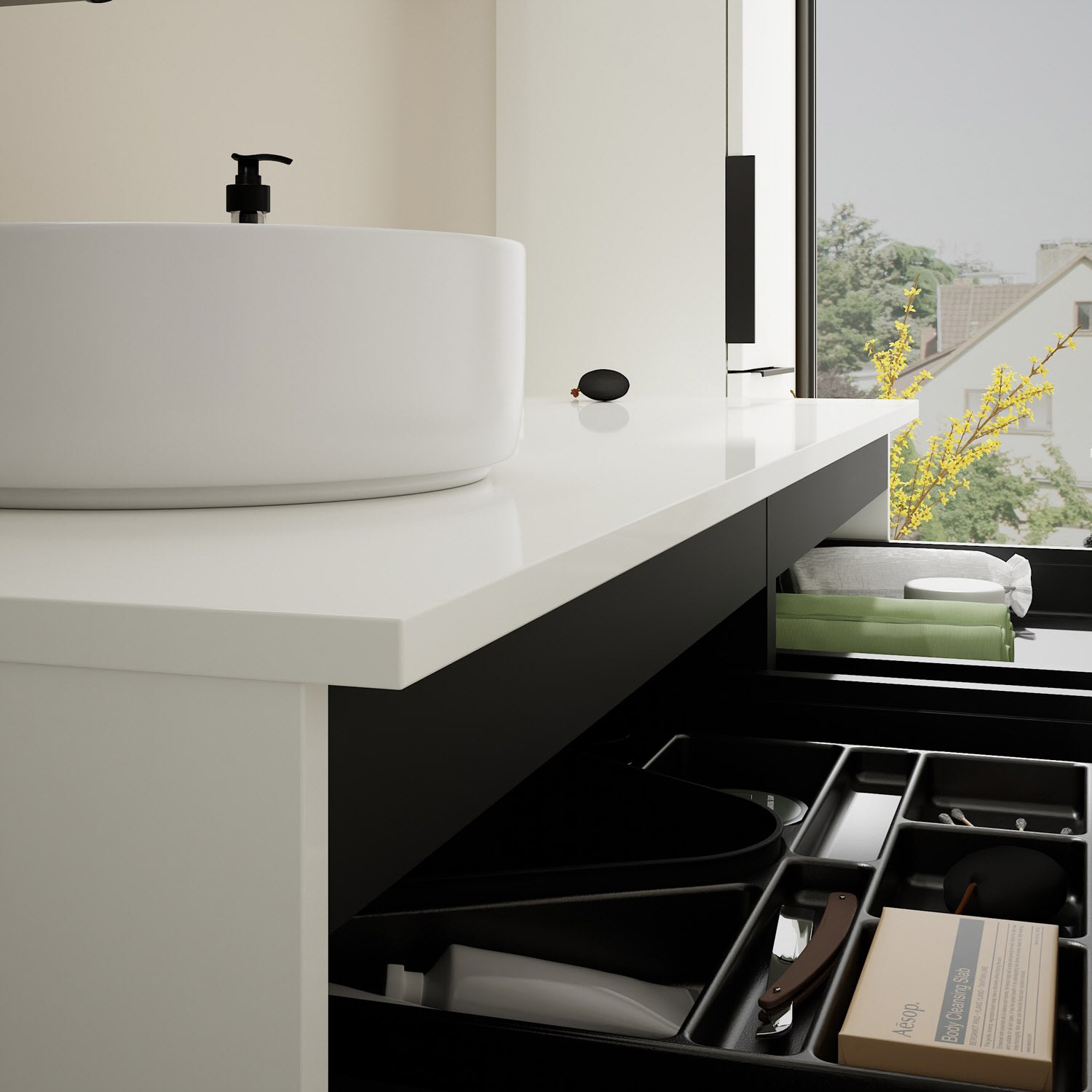 - 2 Schubladen oben, 35 cm tief, mit Siphonausschnitt und Inneneinteilung