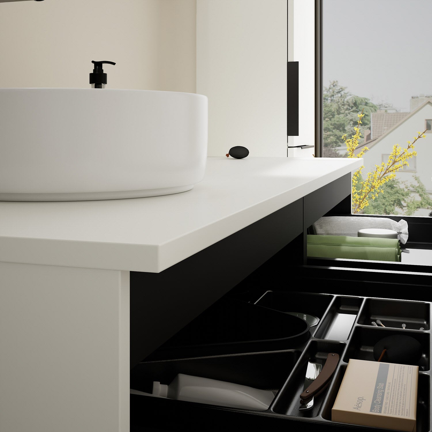 - 2 Schubladen oben, 35 cm tief, mit Siphonausschnitt und Inneneinteilung