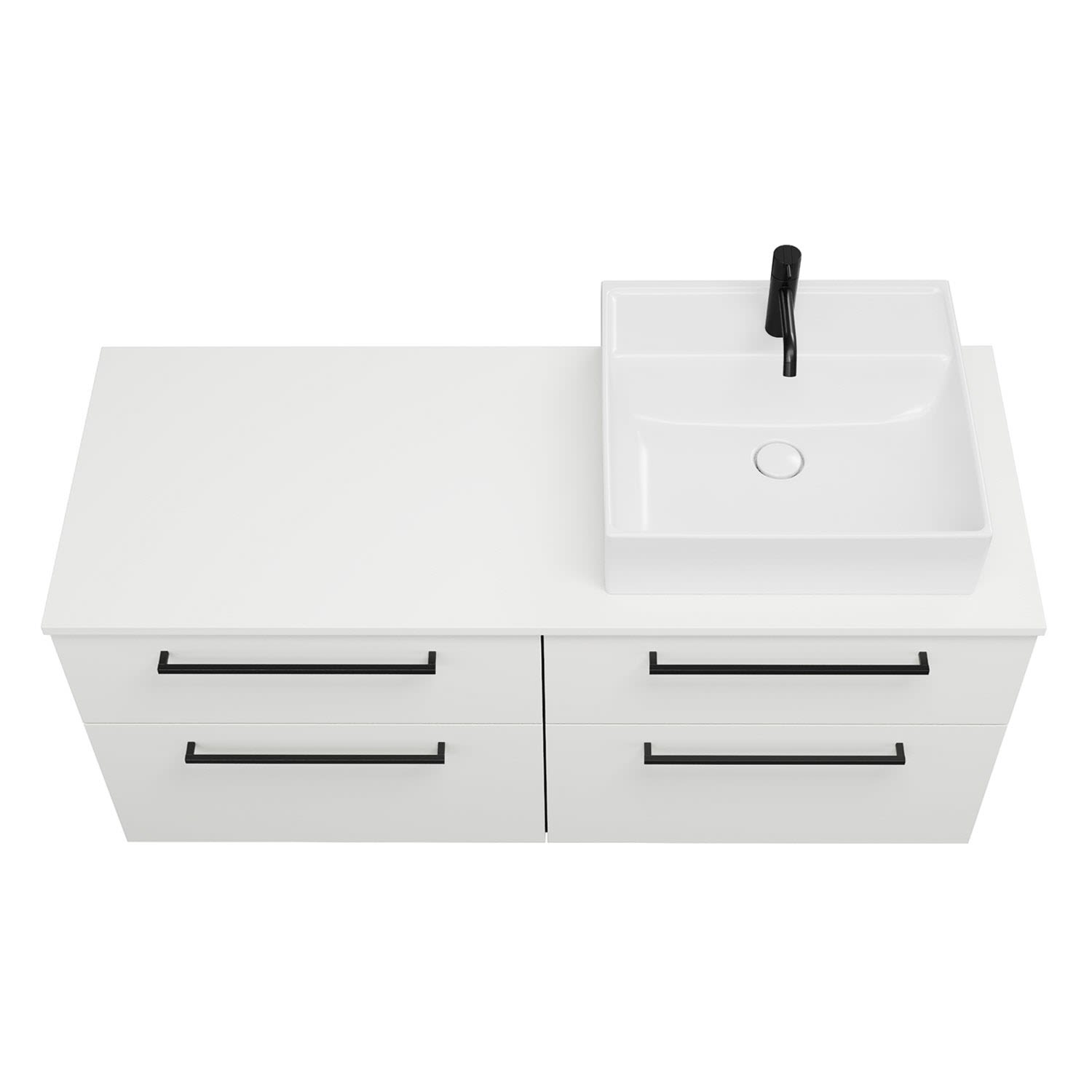 - 2 Schubladen oben, 35 cm tief, mit Siphonausschnitt und Inneneinteilung