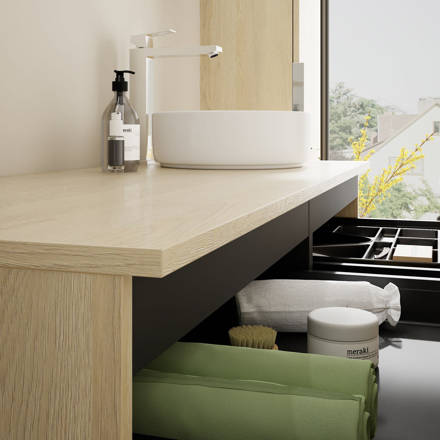 - 2 Schubladen oben, 35 cm tief, mit Siphonausschnitt und Inneneinteilung