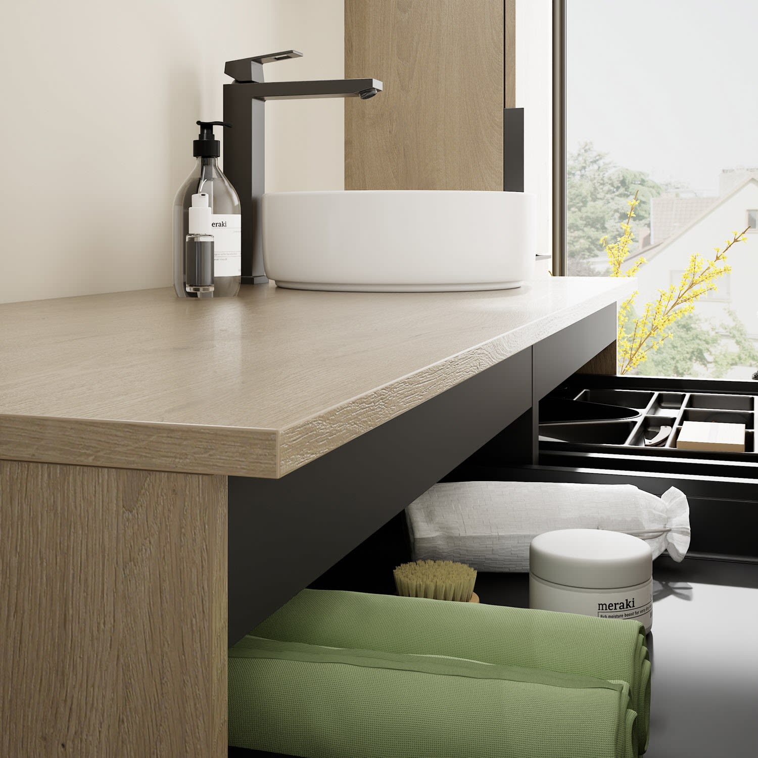 - 2 Schubladen oben, 35 cm tief, mit Siphonausschnitt und Inneneinteilung