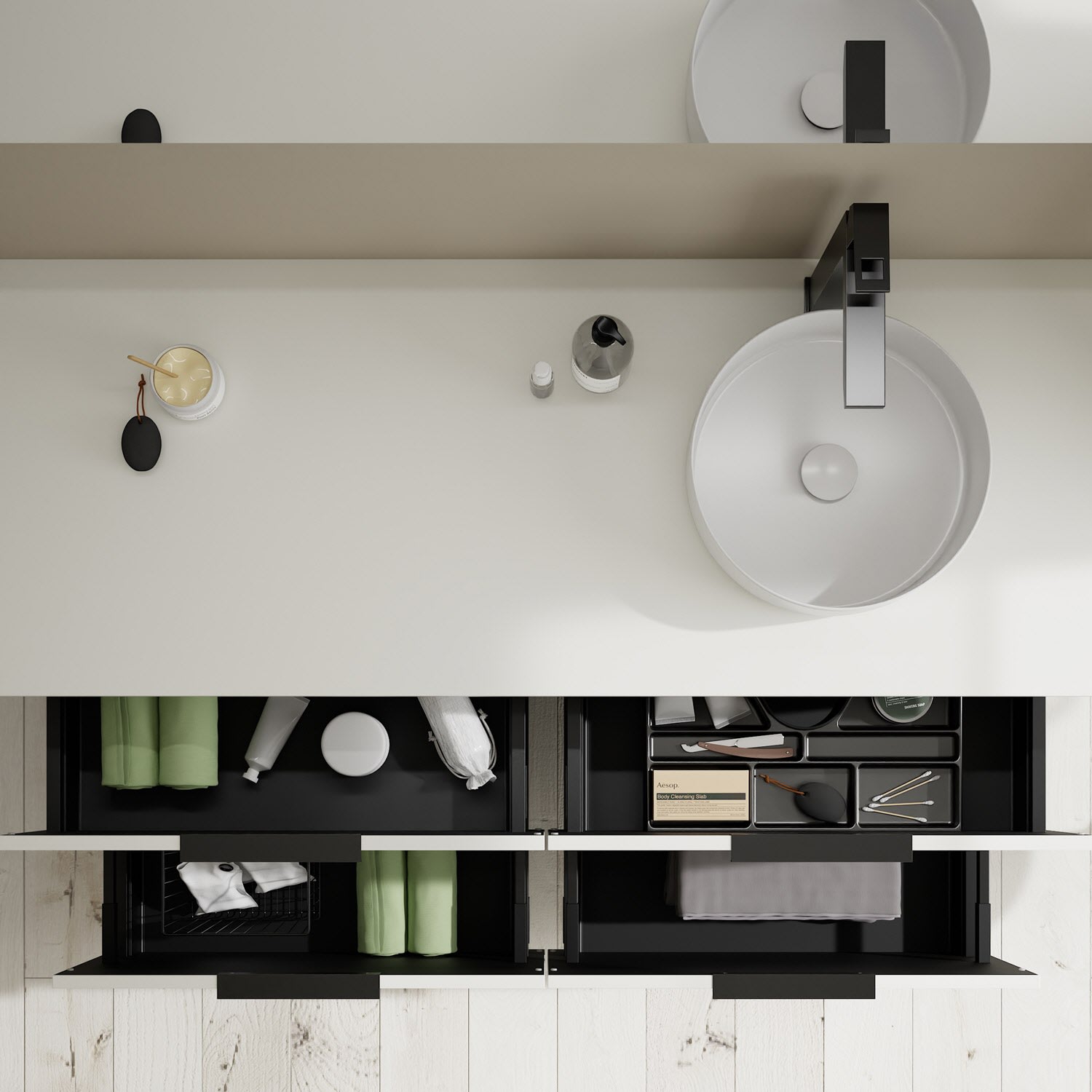 - 2 Schubladen oben, 35 cm tief, mit Siphonausschnitt und Inneneinteilung