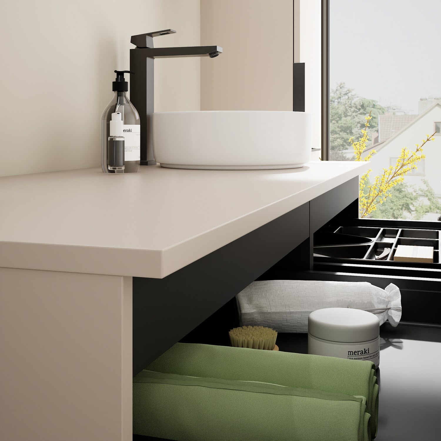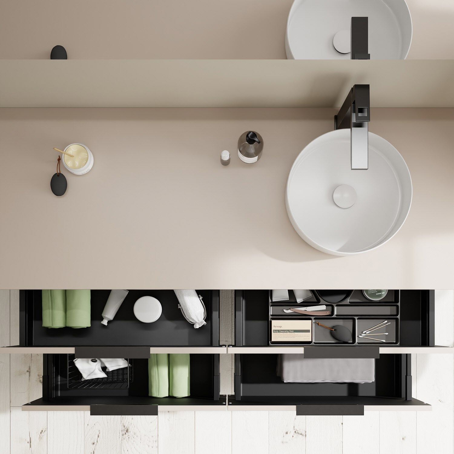 - 2 Schubladen oben, 35 cm tief, mit Siphonausschnitt und Inneneinteilung