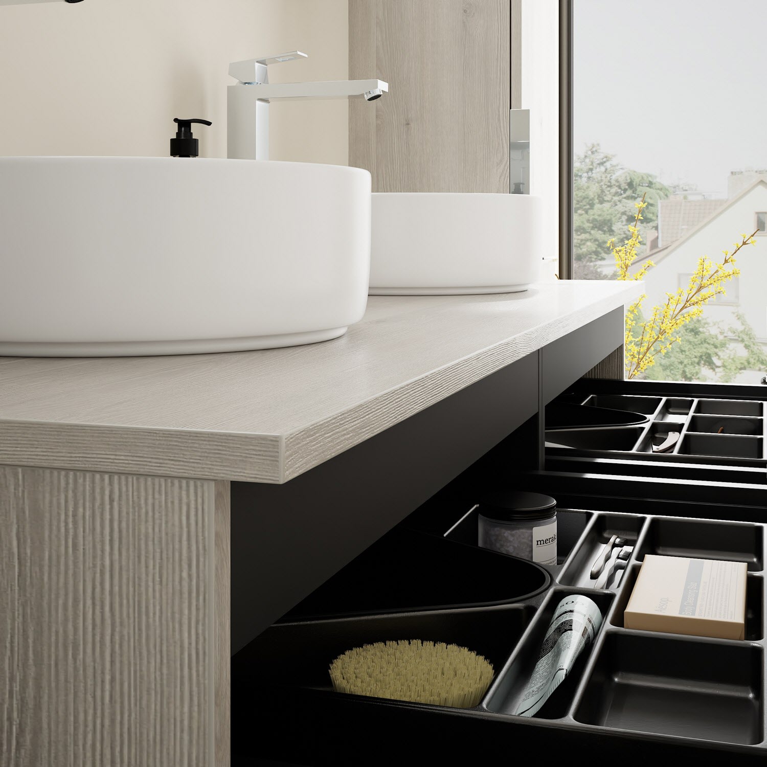 - 2 Schubladen oben, 35 cm tief, mit Siphonausschnitt und Inneneinteilung