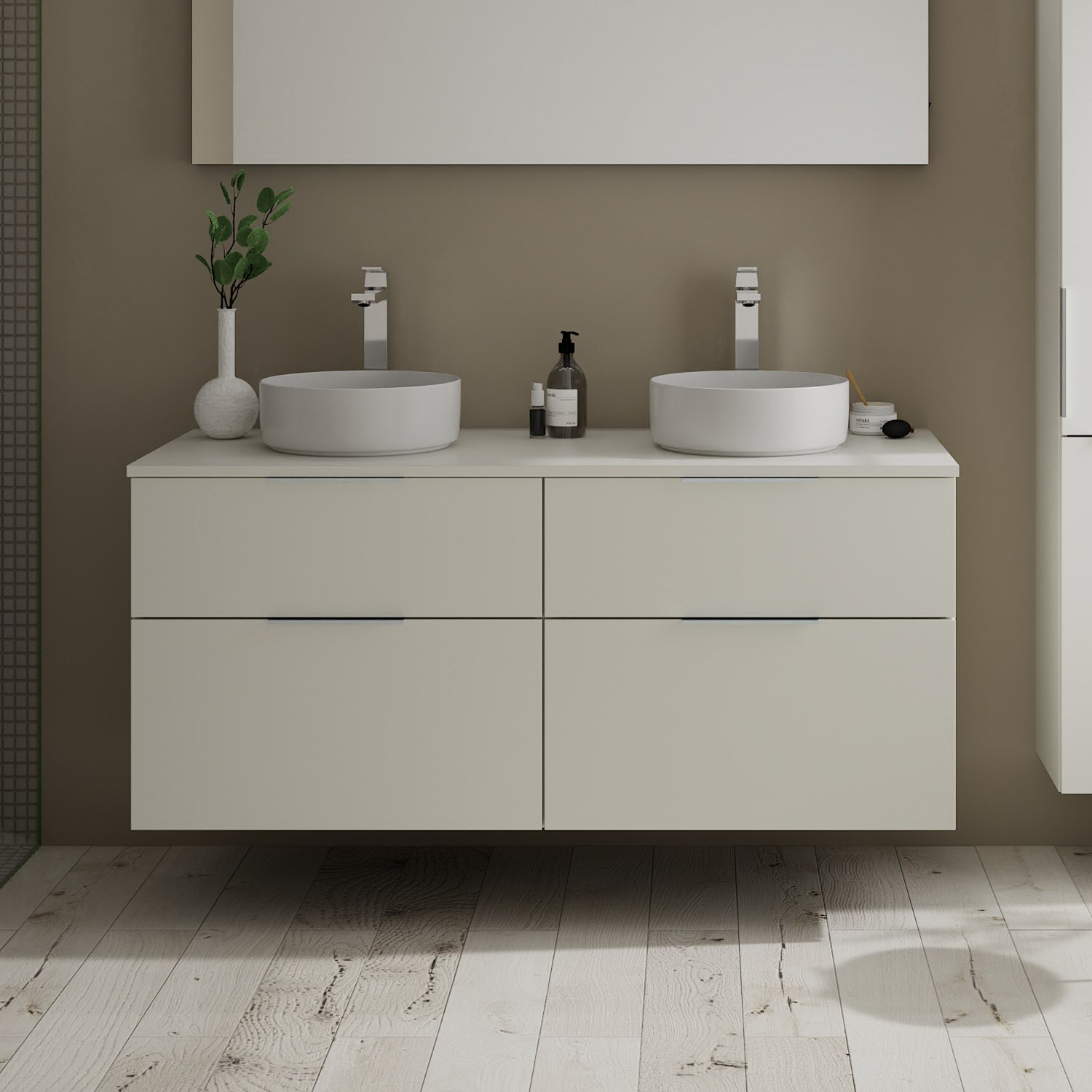 - 2 Schubladen oben, 35 cm tief, mit Siphonausschnitt und Inneneinteilung