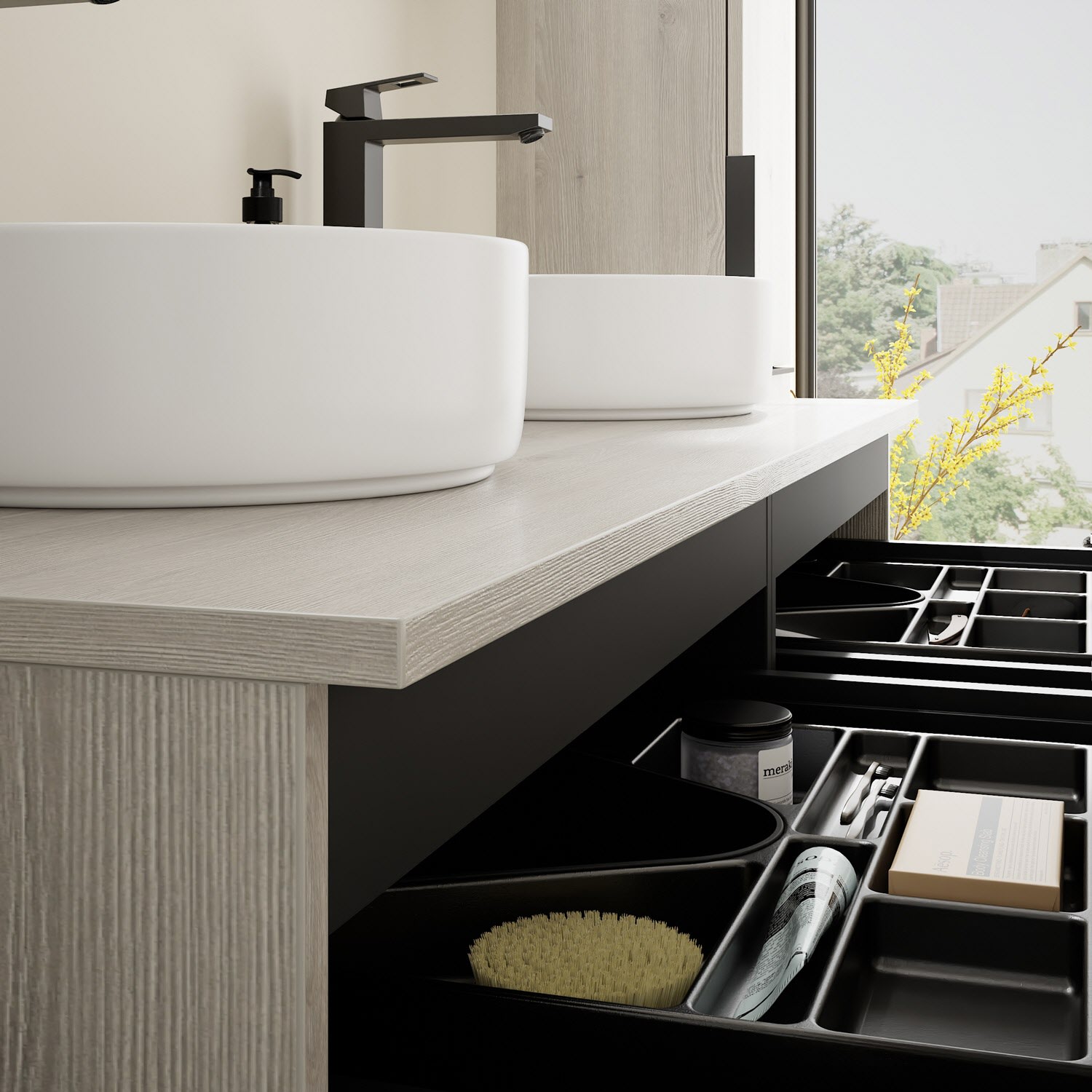 - 2 Schubladen oben, 35 cm tief, mit Siphonausschnitt und Inneneinteilung