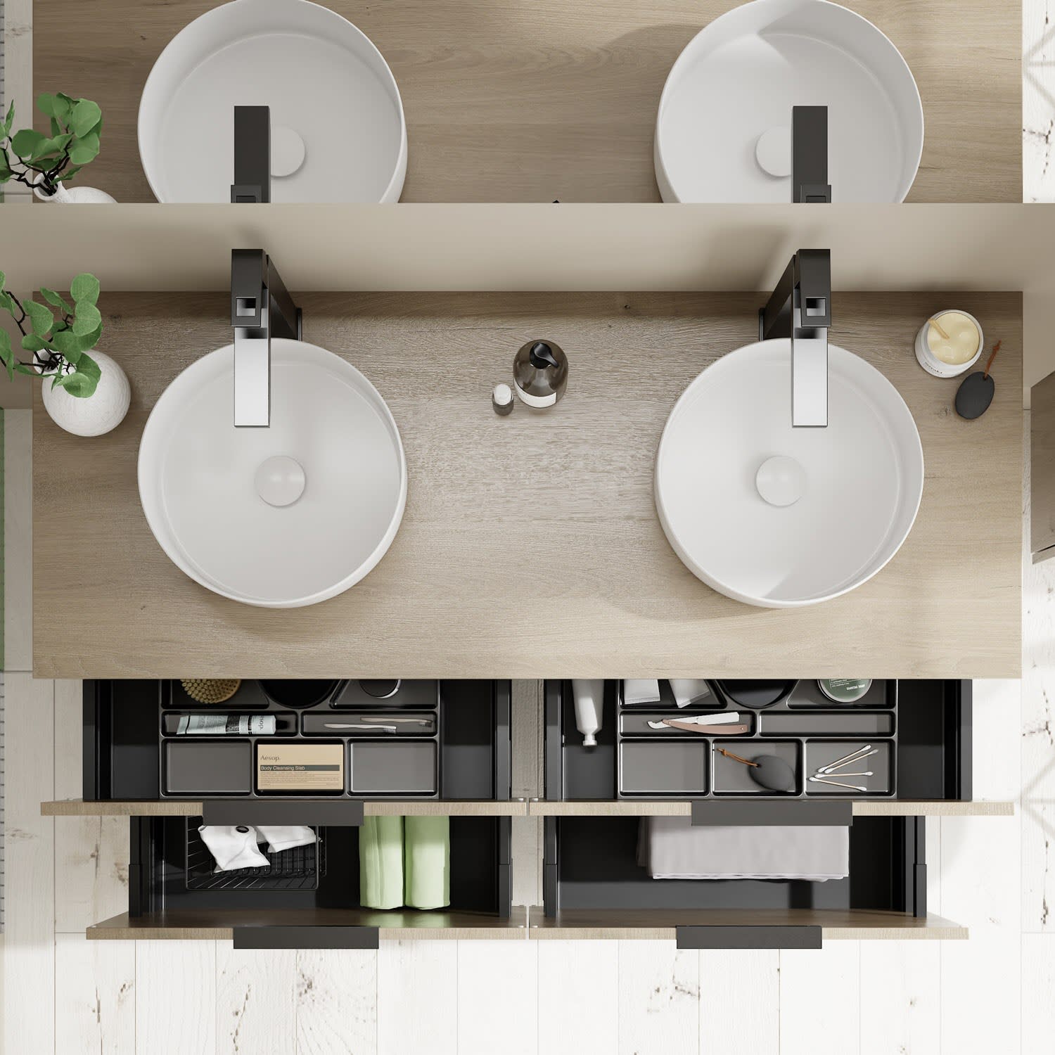 - 2 Schubladen oben, 35 cm tief, mit Siphonausschnitt und Inneneinteilung