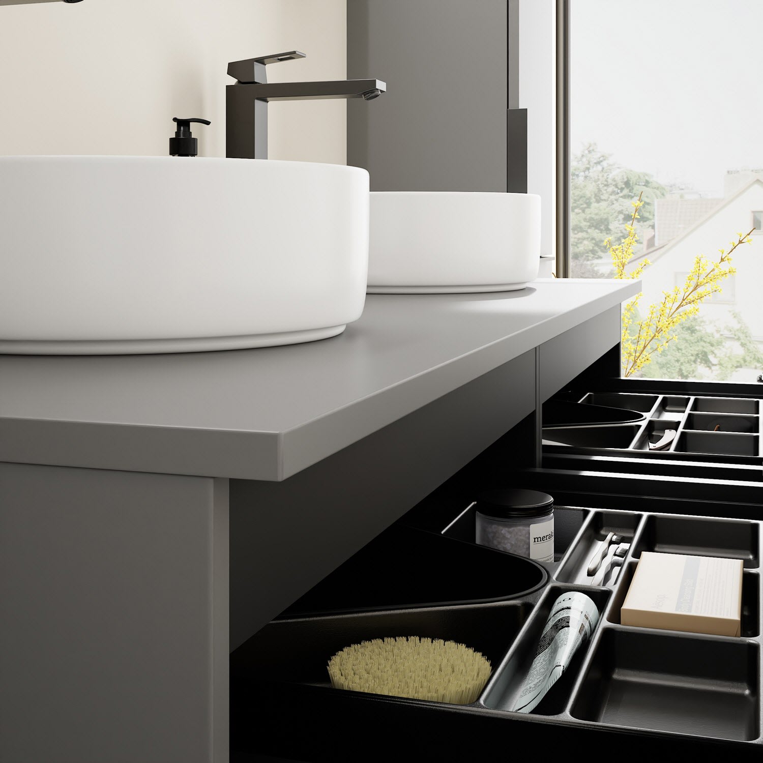 - 2 Schubladen oben, 35 cm tief, mit Siphonausschnitt und Inneneinteilung