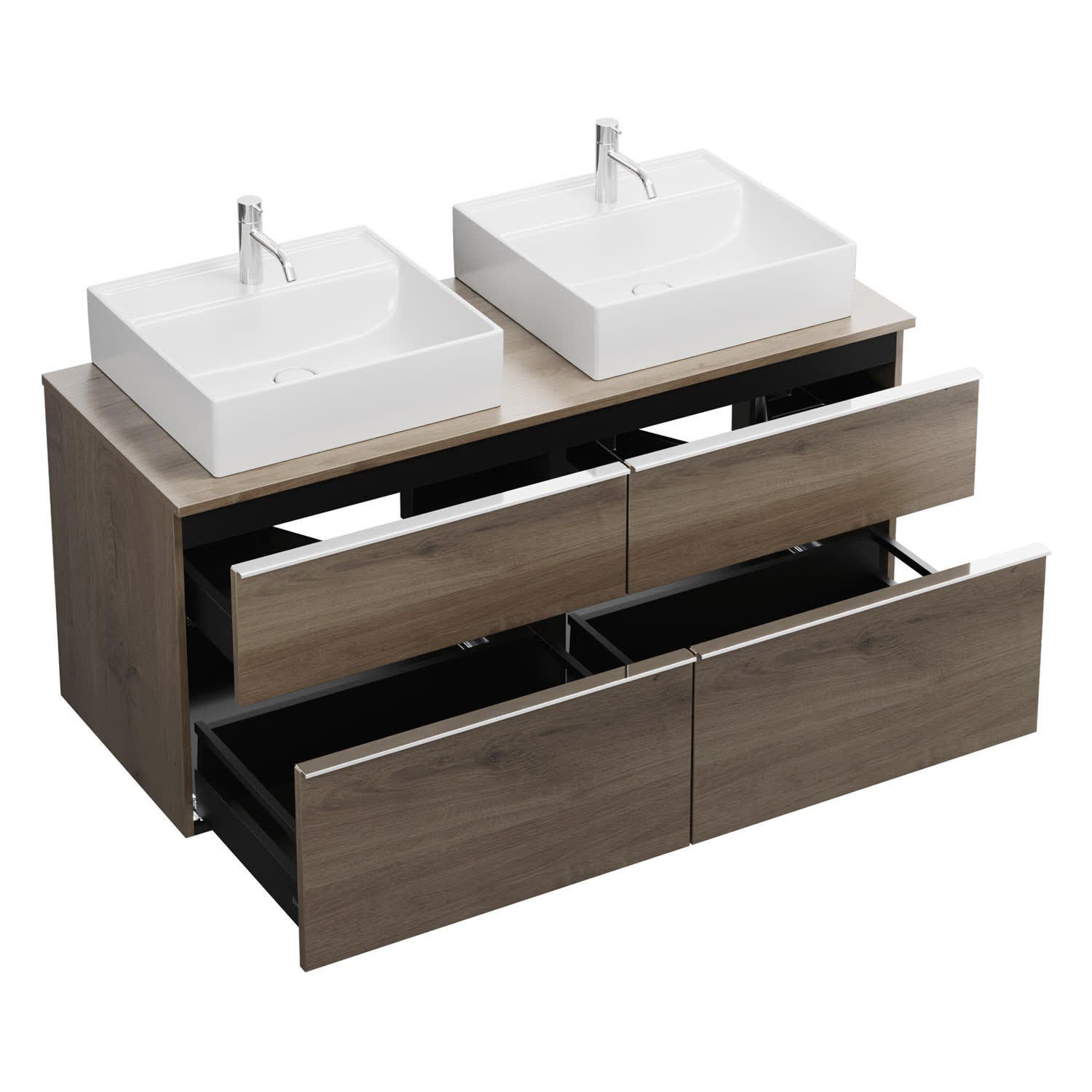 - 2 Schubladen oben, 35 cm tief, mit Siphonausschnitt und Inneneinteilung