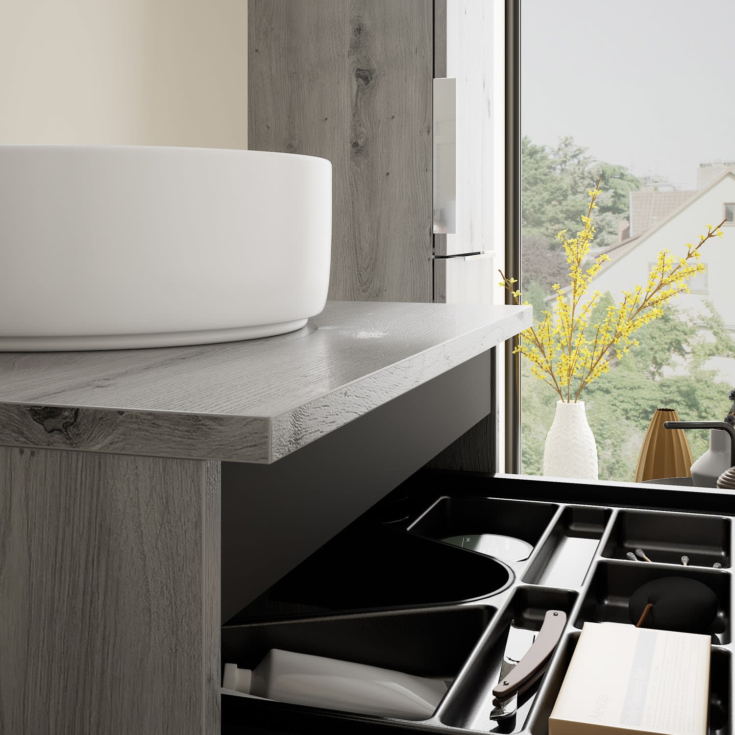- 1 Schublade oben, 35 cm tief, mit Siphonausschnitt und Inneneinteilung
