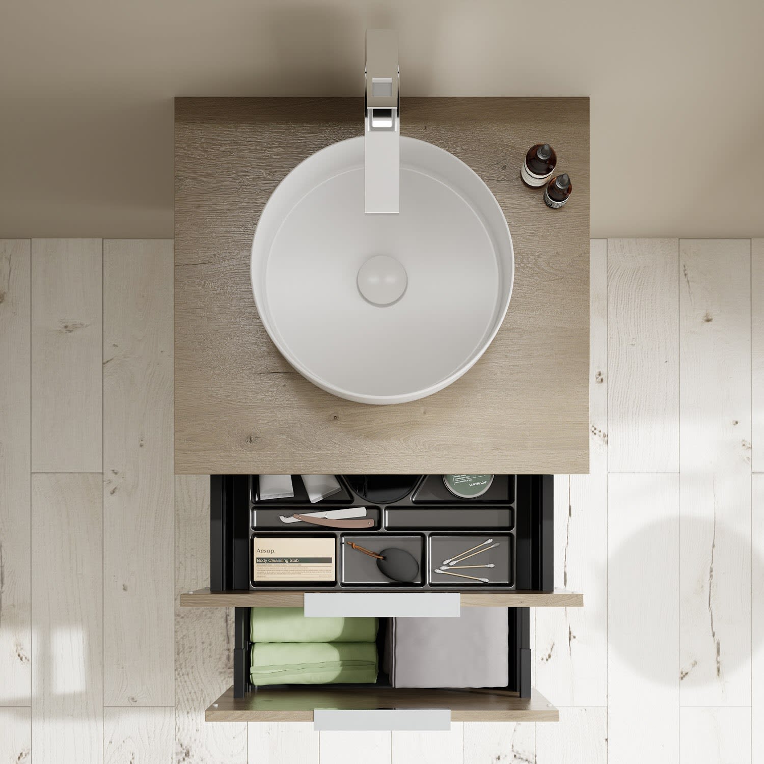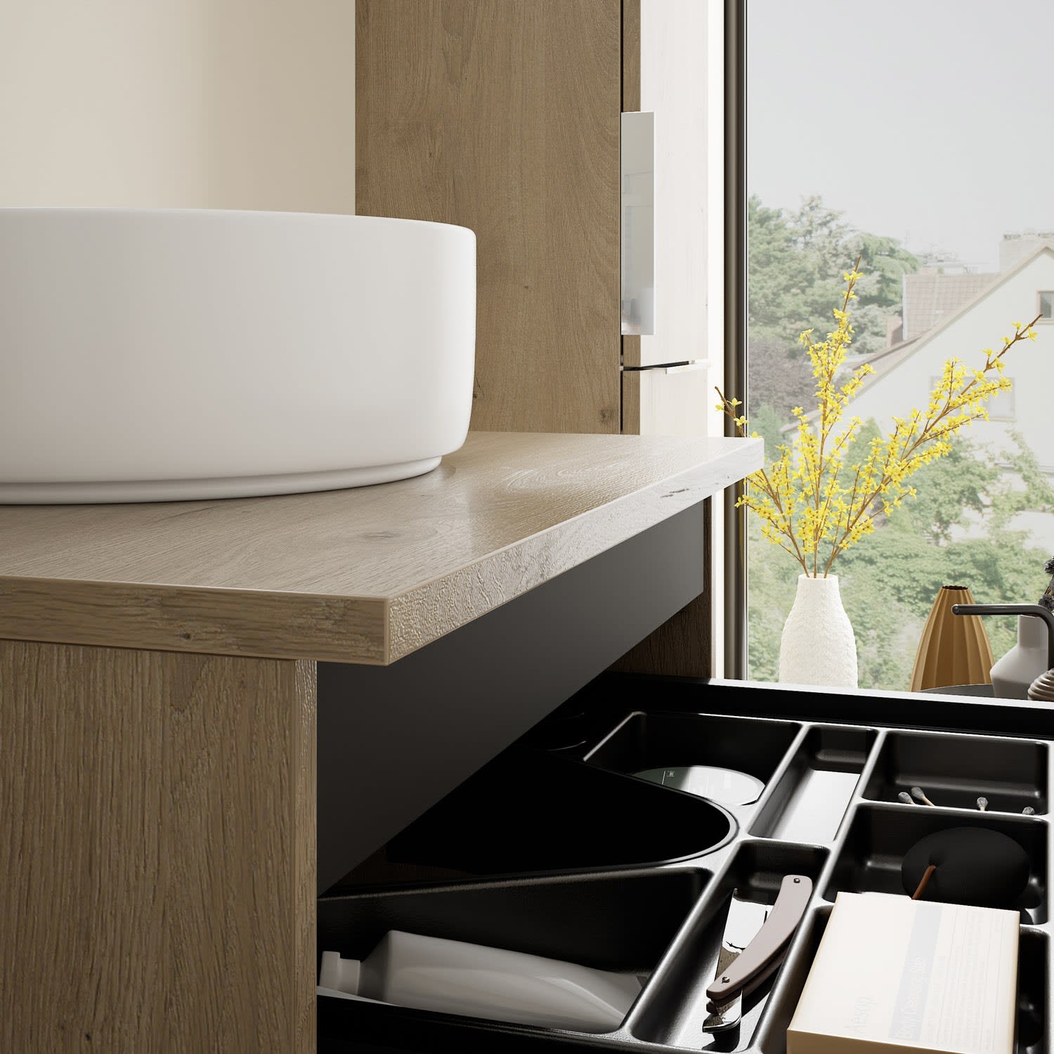 - 1 Schublade oben, 35 cm tief, mit Siphonausschnitt und Inneneinteilung