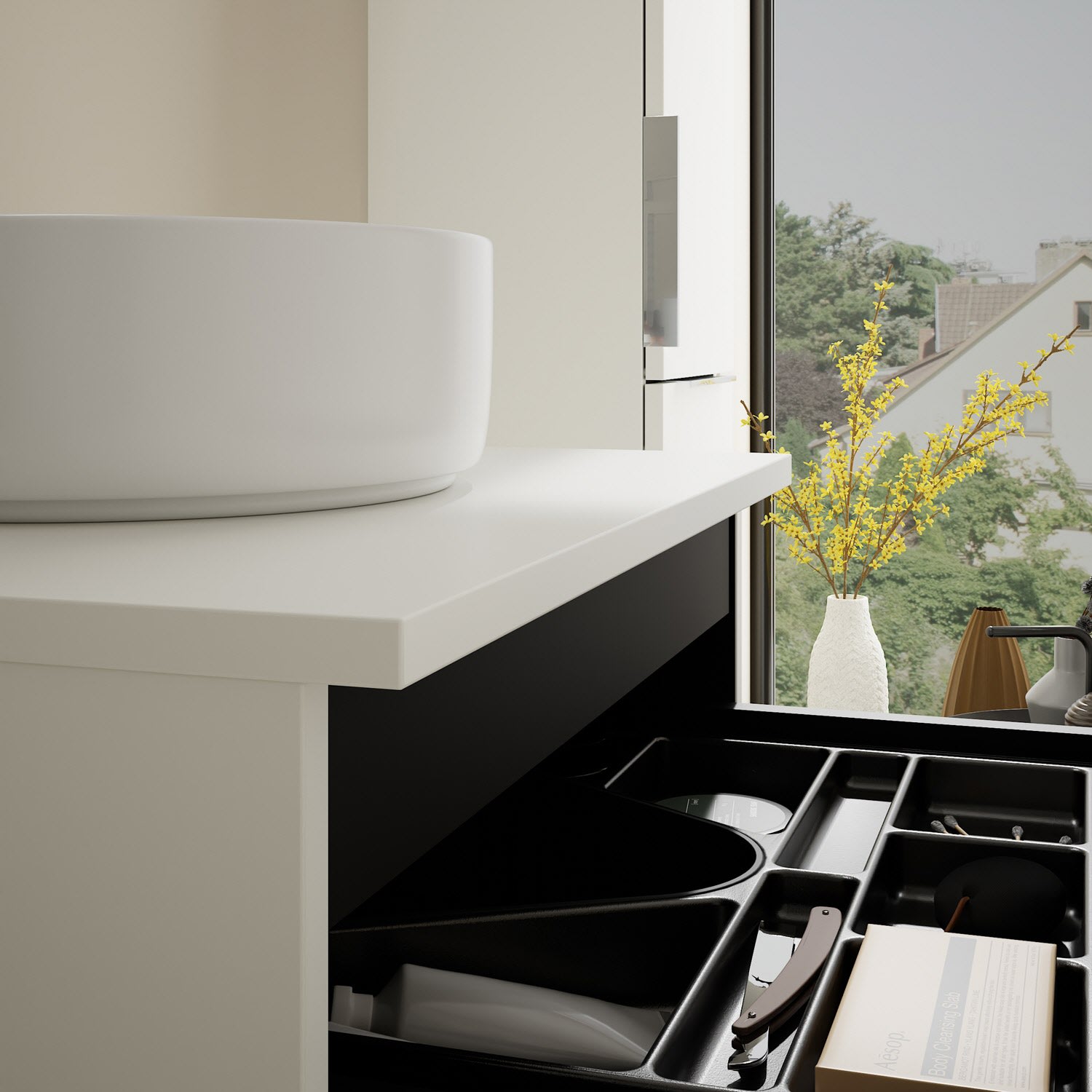 - 1 Schublade oben, 35 cm tief, mit Siphonausschnitt und Inneneinteilung
