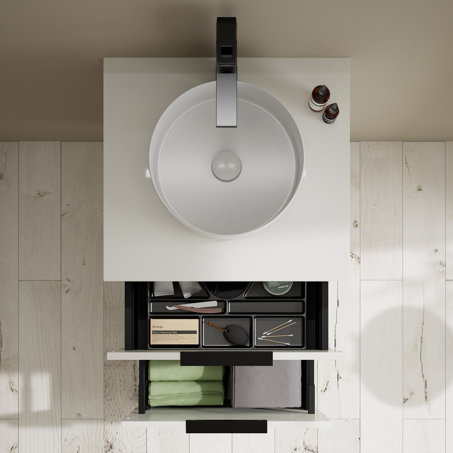 Aufsatzwaschtische müssen immer, mindestens 3 cm von den Außenkanten der Konsolenplatte entfernt sein.
