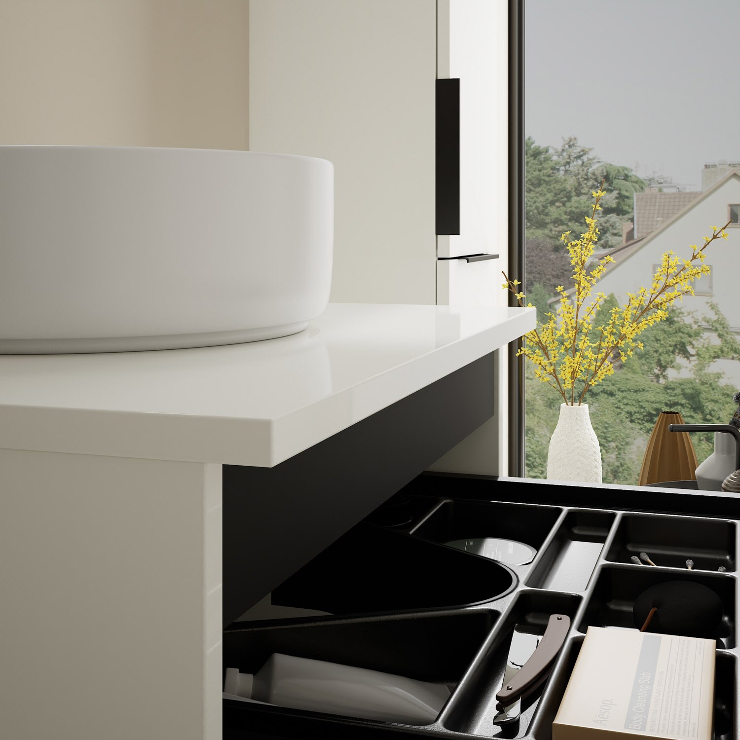 - 1 Schublade oben, 35 cm tief, mit Siphonausschnitt und Inneneinteilung