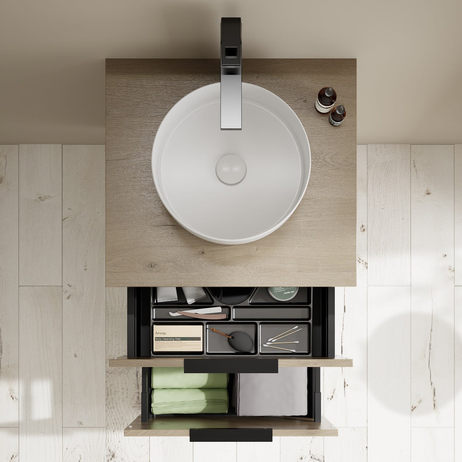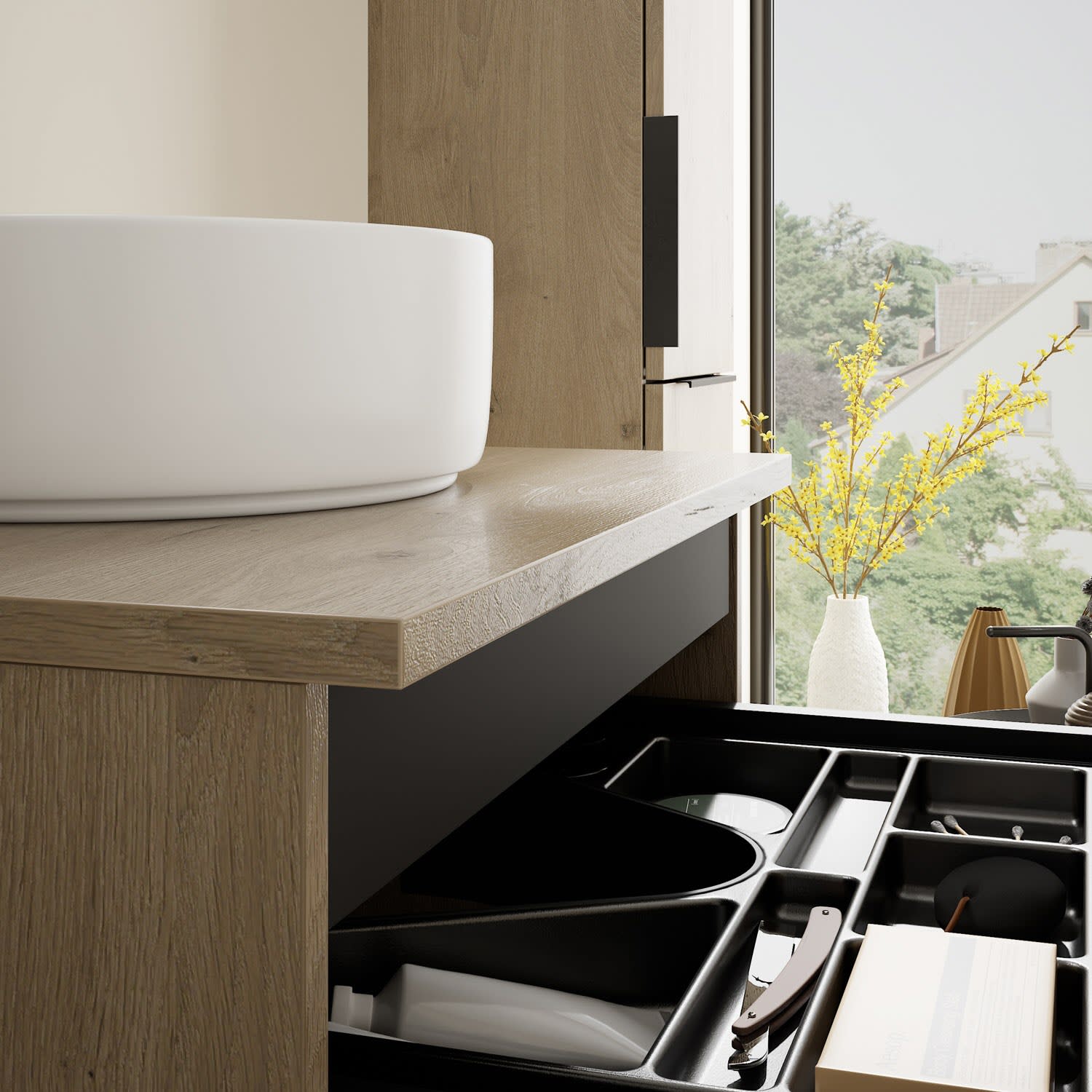 - 1 Schublade oben, 35 cm tief, mit Siphonausschnitt und Inneneinteilung