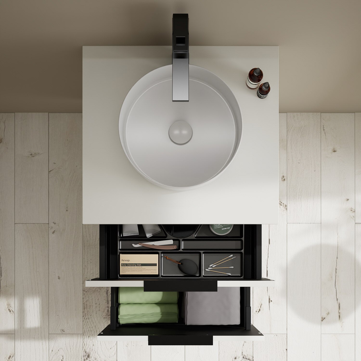 - 1 Schublade oben, 35 cm tief, mit Siphonausschnitt und Inneneinteilung