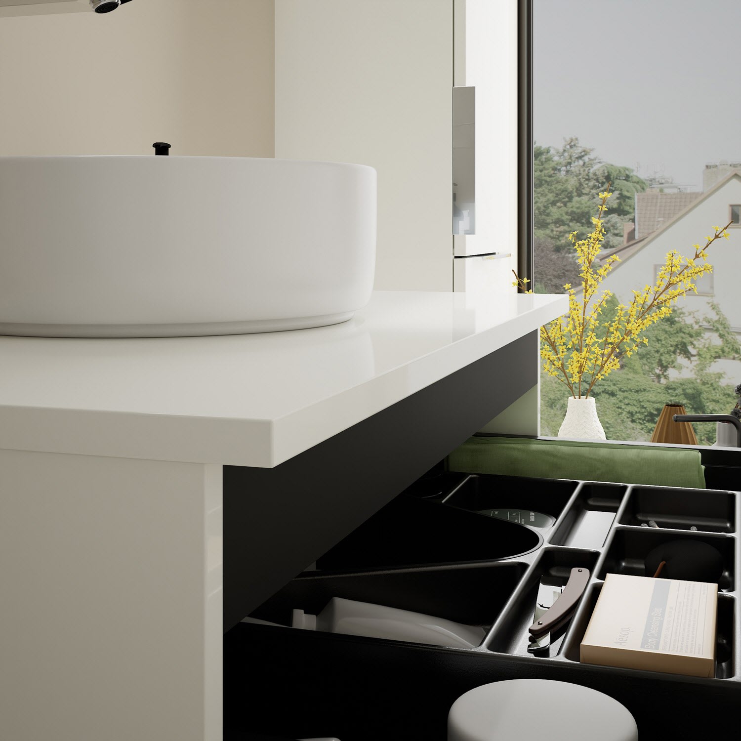 - 1 Schublade oben, 35 cm tief, mit Siphonausschnitt und Inneneinteilung