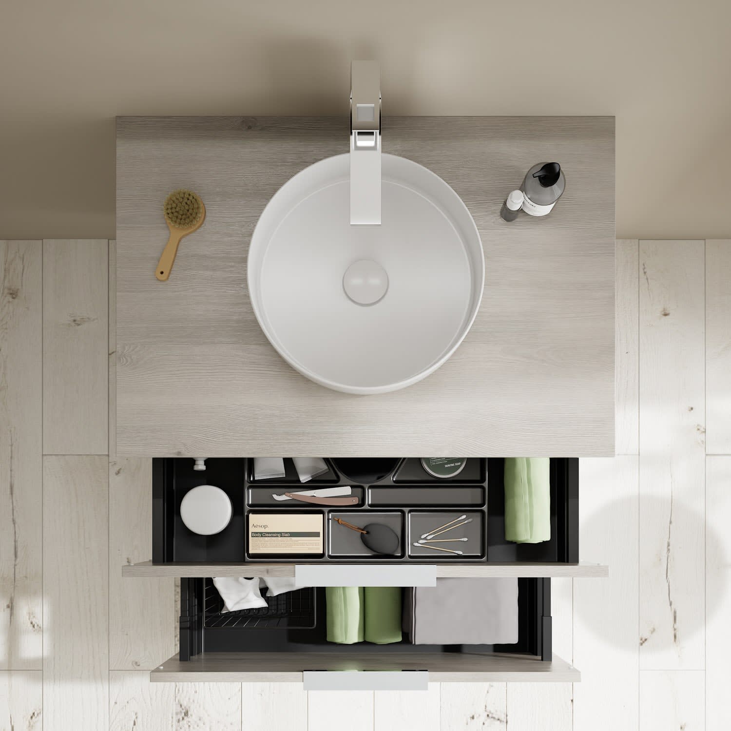 Aufsatzwaschtische müssen immer, mindestens 3 cm von den Außenkanten der Konsolenplatte entfernt sein.