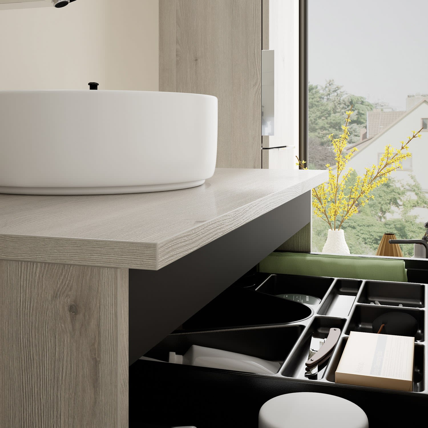 - 1 Schublade oben, 35 cm tief, mit Siphonausschnitt und Inneneinteilung