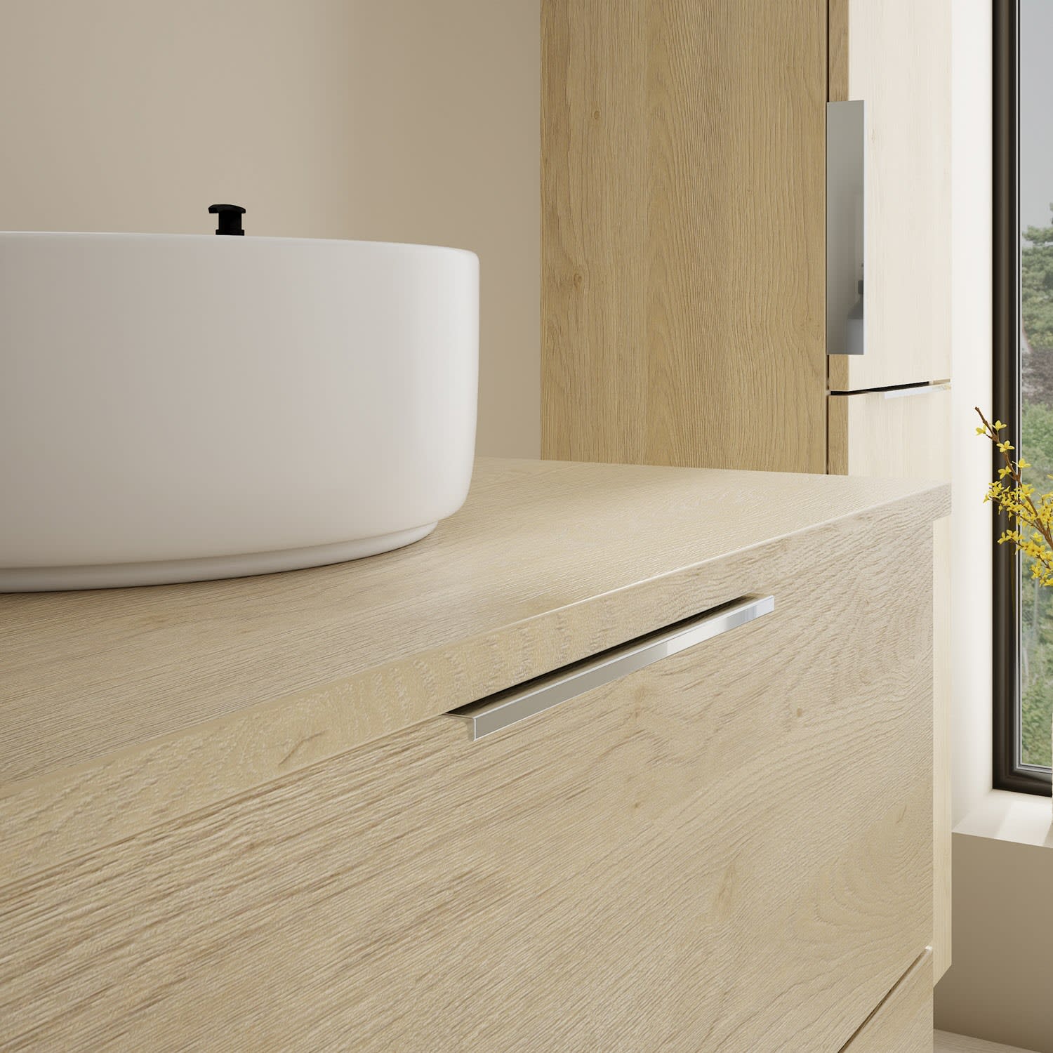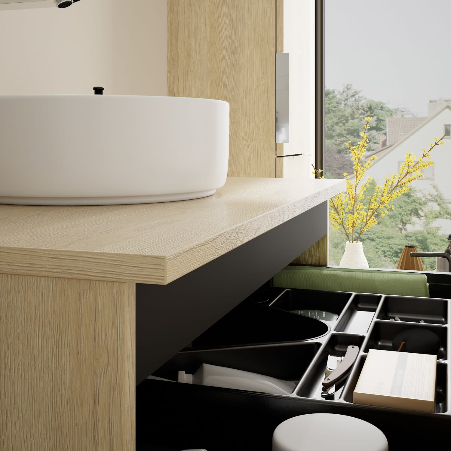 - 1 Schublade oben, 35 cm tief, mit Siphonausschnitt und Inneneinteilung