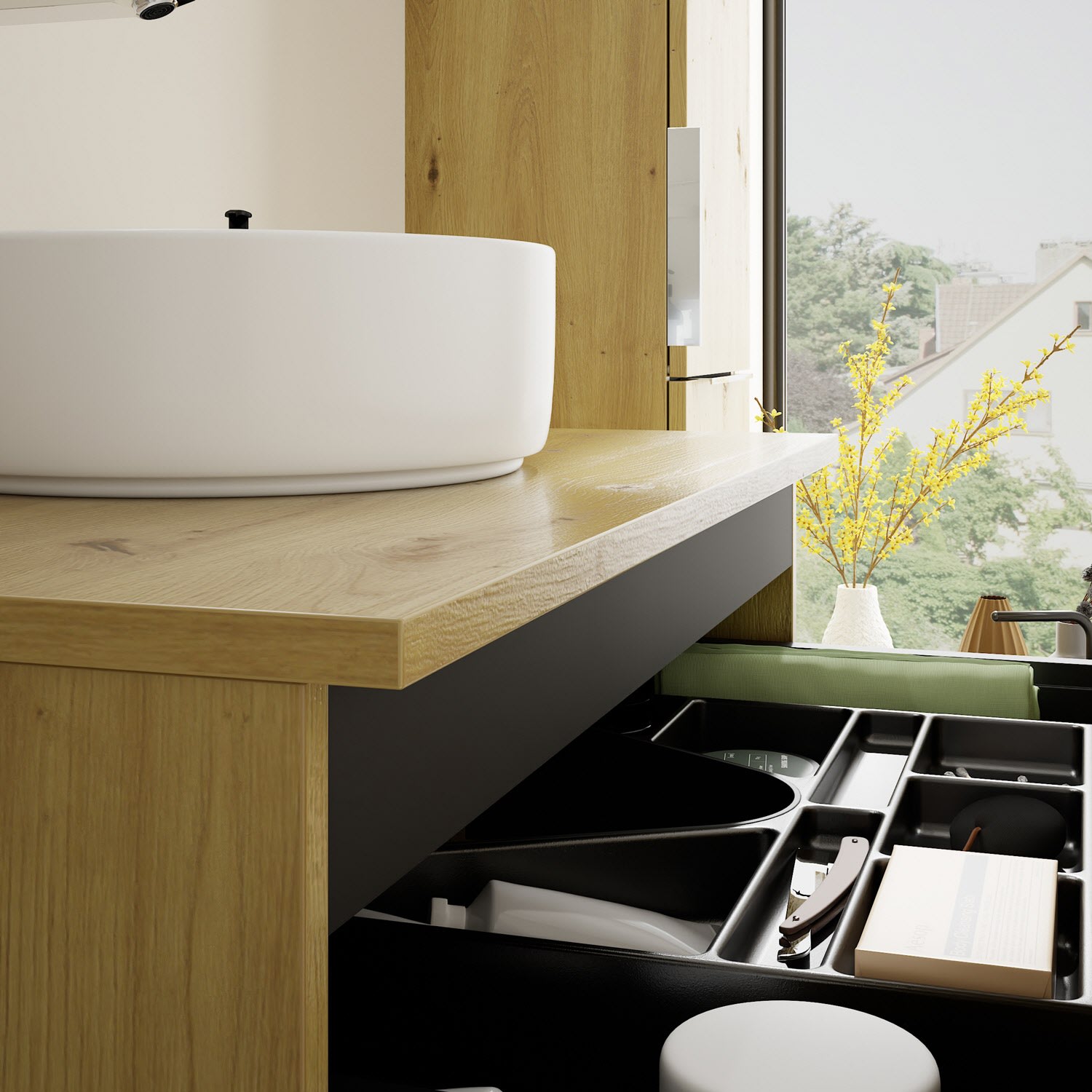 - 1 Schublade oben, 35 cm tief, mit Siphonausschnitt und Inneneinteilung