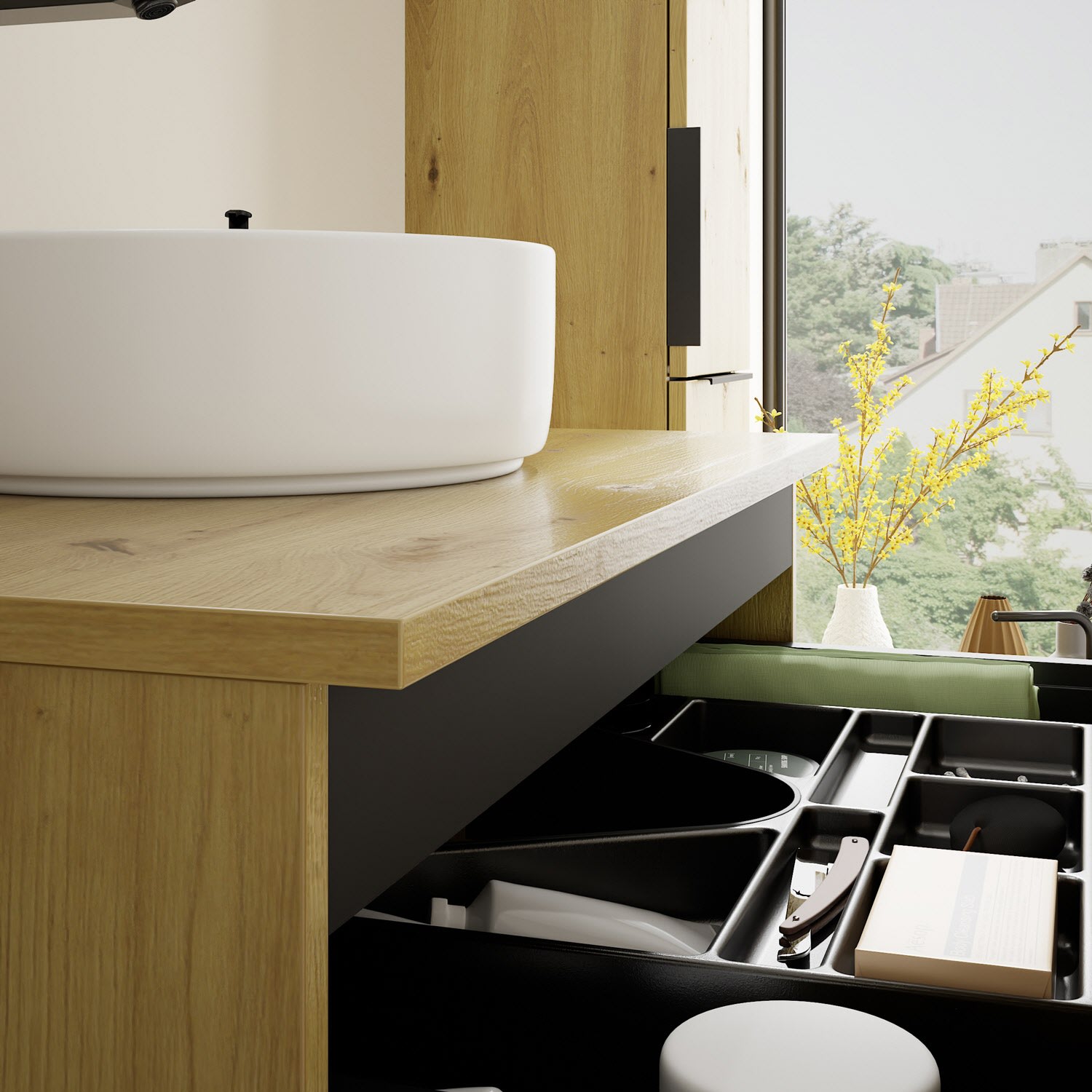- 1 Schublade oben, 35 cm tief, mit Siphonausschnitt und Inneneinteilung