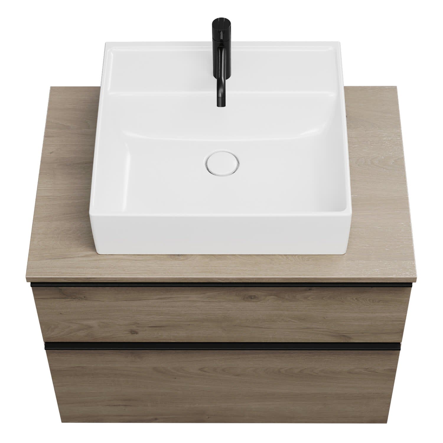 - 1 Schublade oben, 35 cm tief, mit Siphonausschnitt und Inneneinteilung