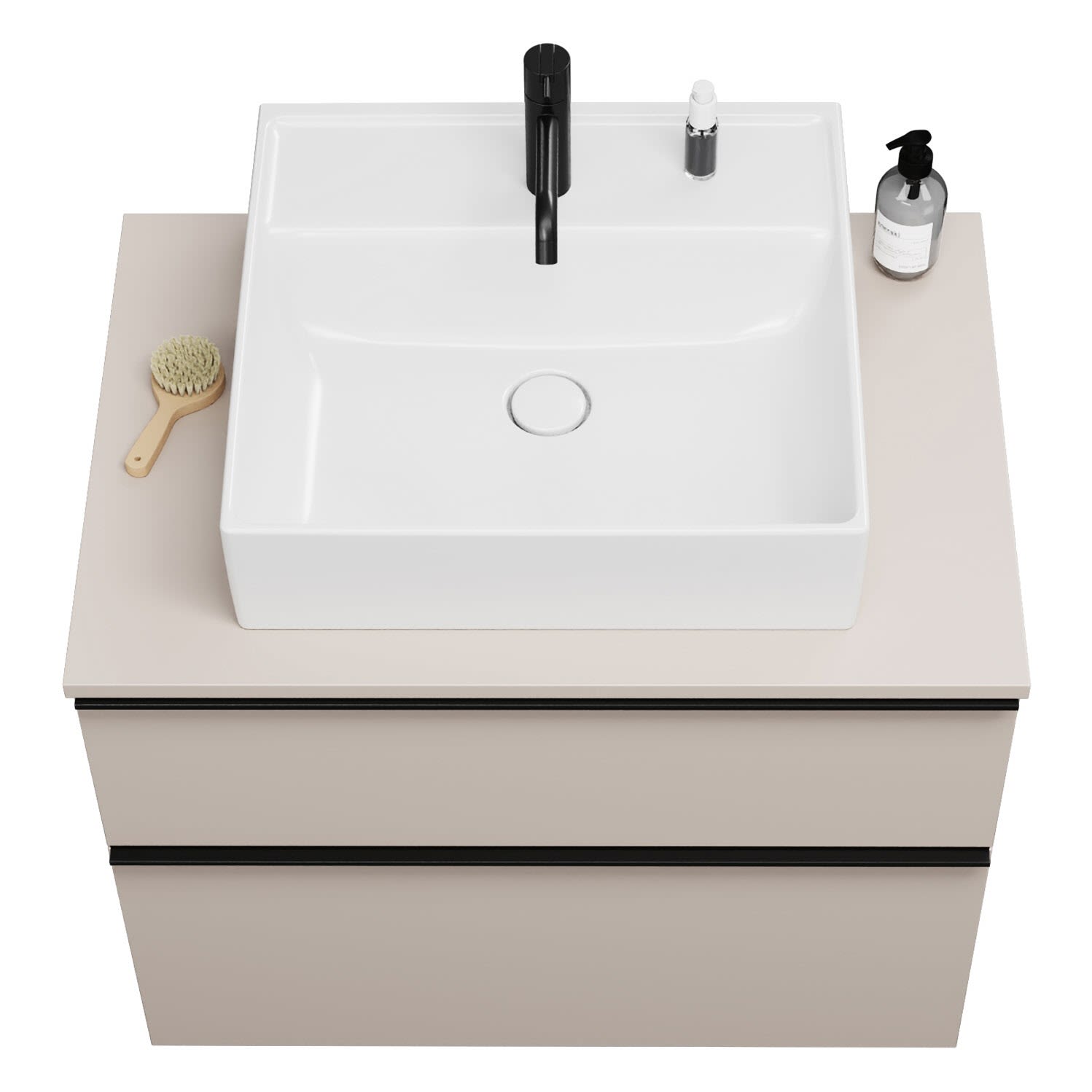 - 1 Schublade oben, 35 cm tief, mit Siphonausschnitt und Inneneinteilung