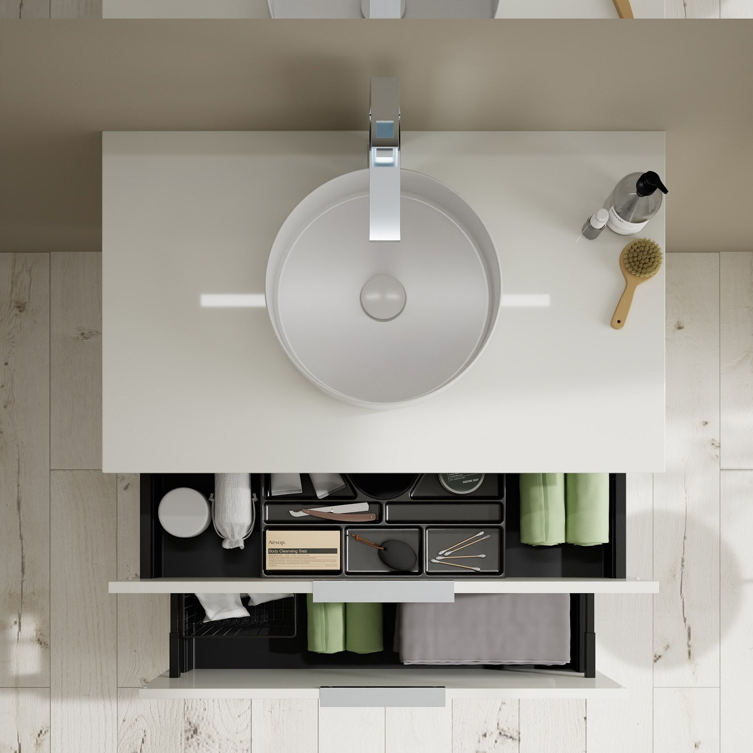 - 1 Schublade oben, 35 cm tief, mit Siphonausschnitt und Inneneinteilung