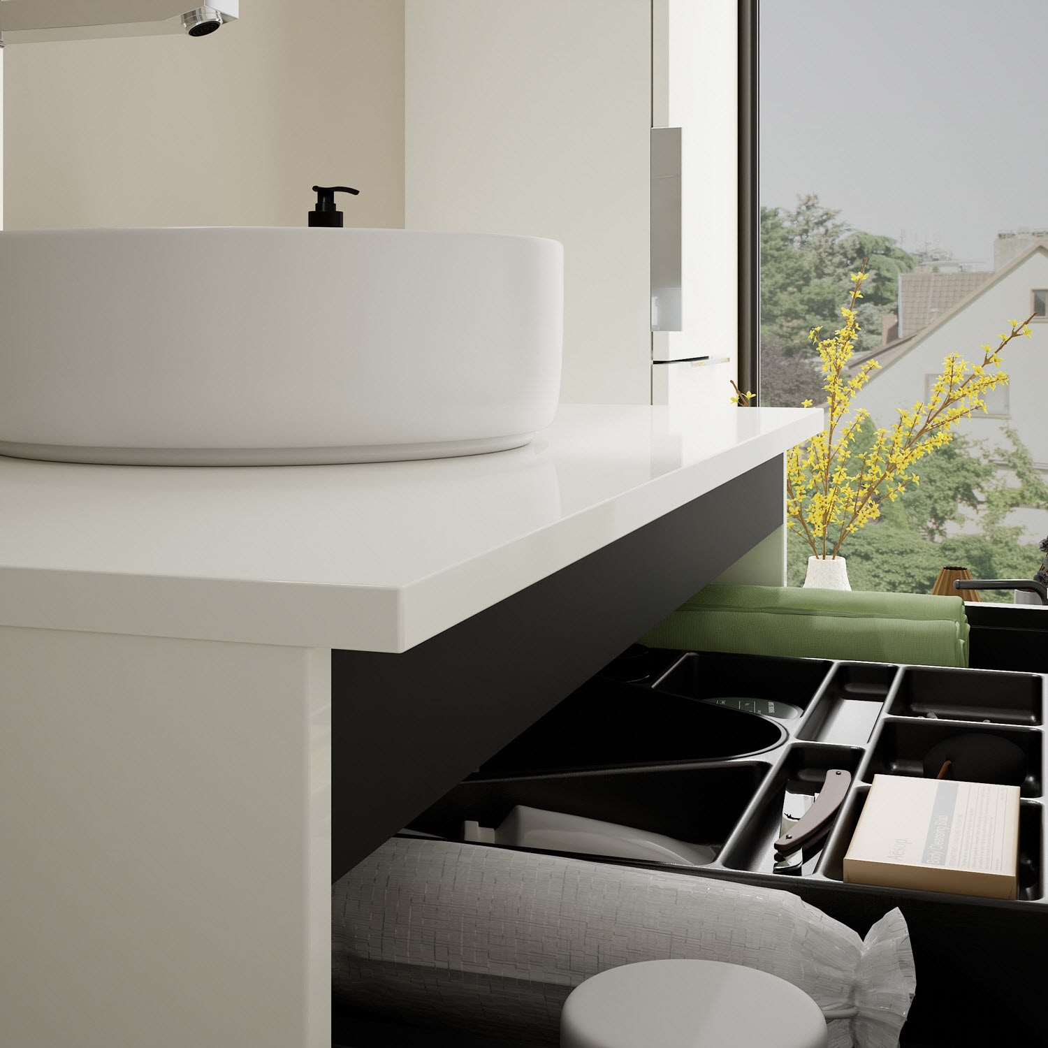 - 1 Schublade oben, 35 cm tief, mit Siphonausschnitt und Inneneinteilung