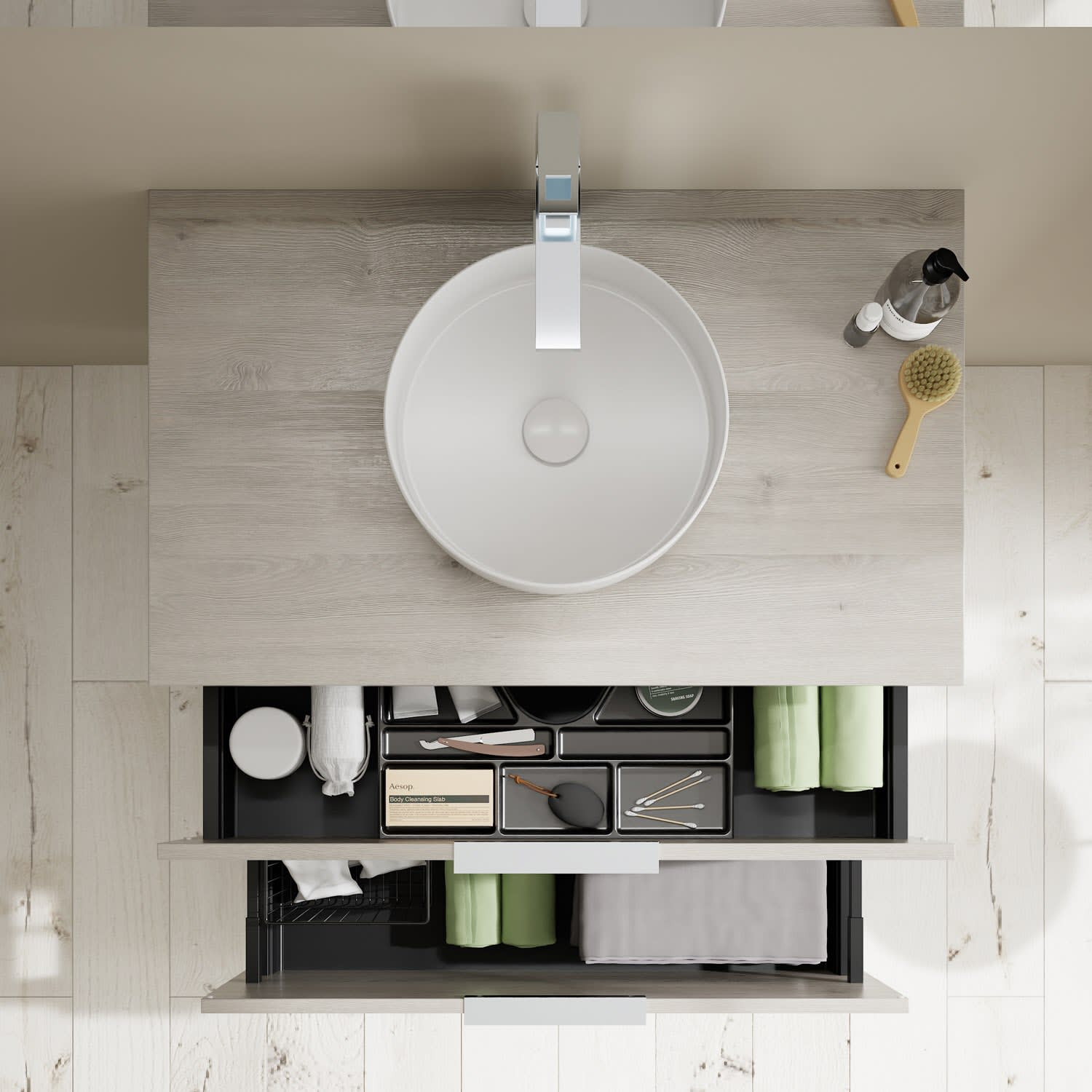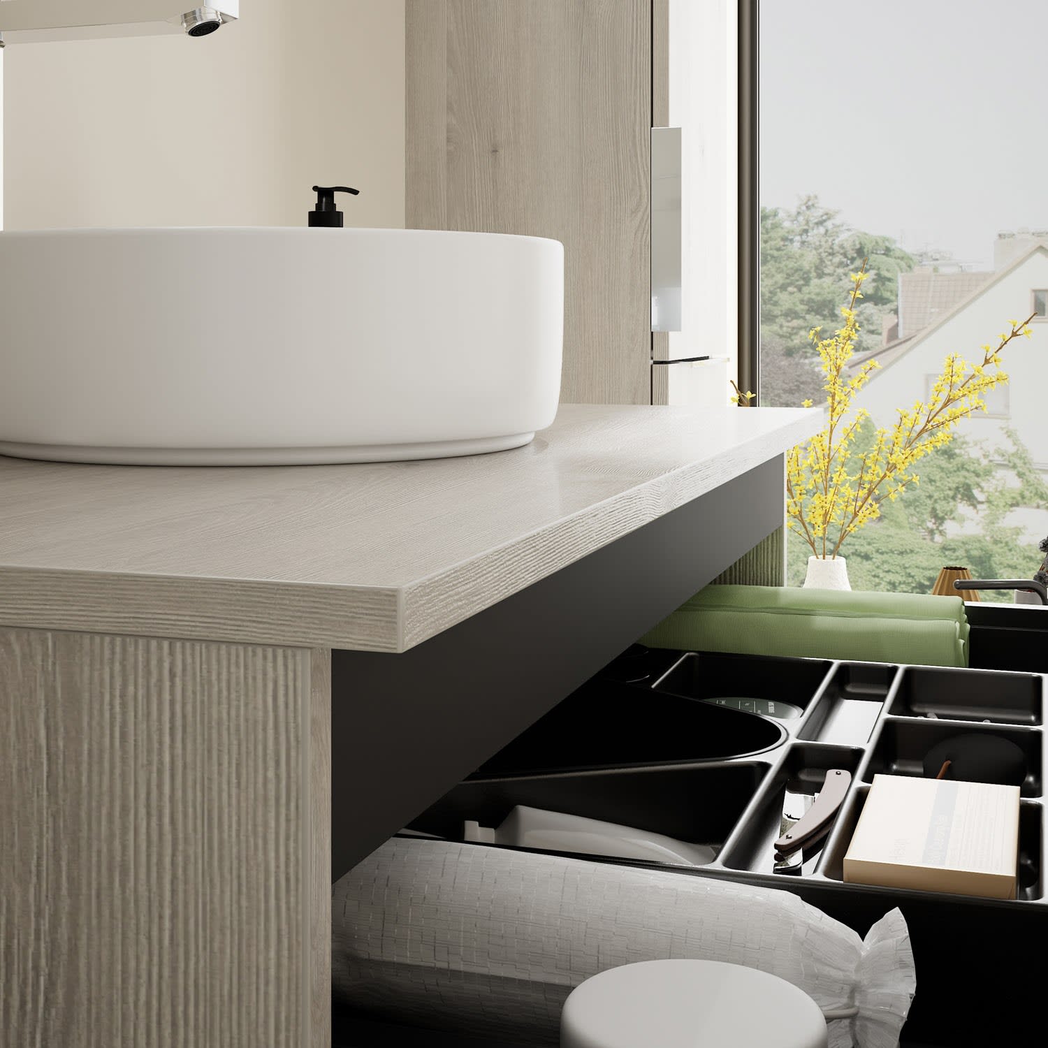 - 1 Schublade oben, 35 cm tief, mit Siphonausschnitt und Inneneinteilung