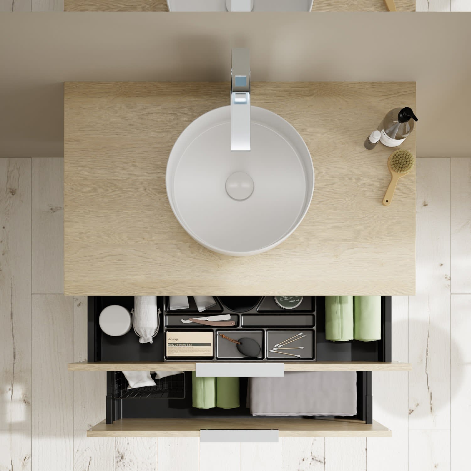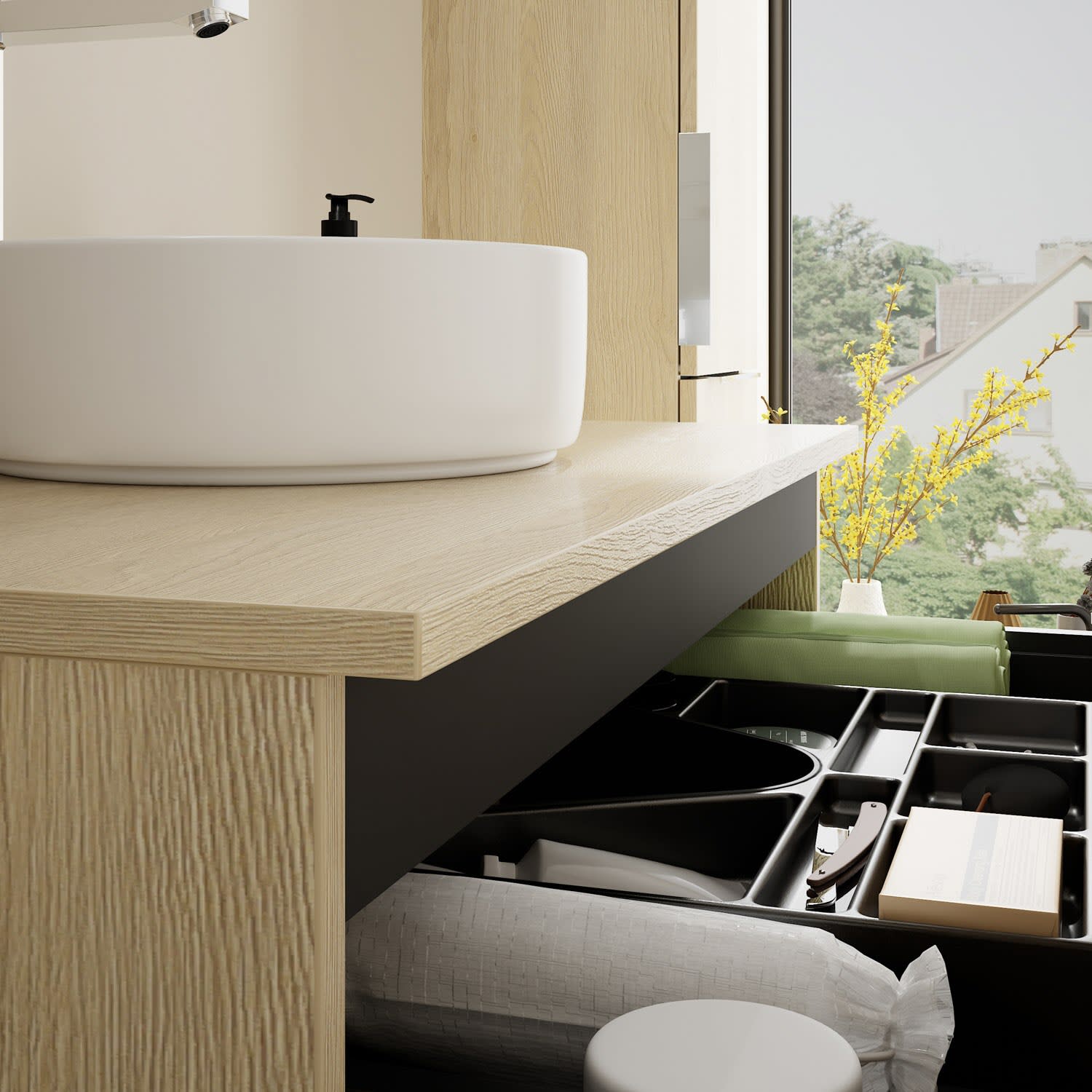 - 1 Schublade oben, 35 cm tief, mit Siphonausschnitt und Inneneinteilung