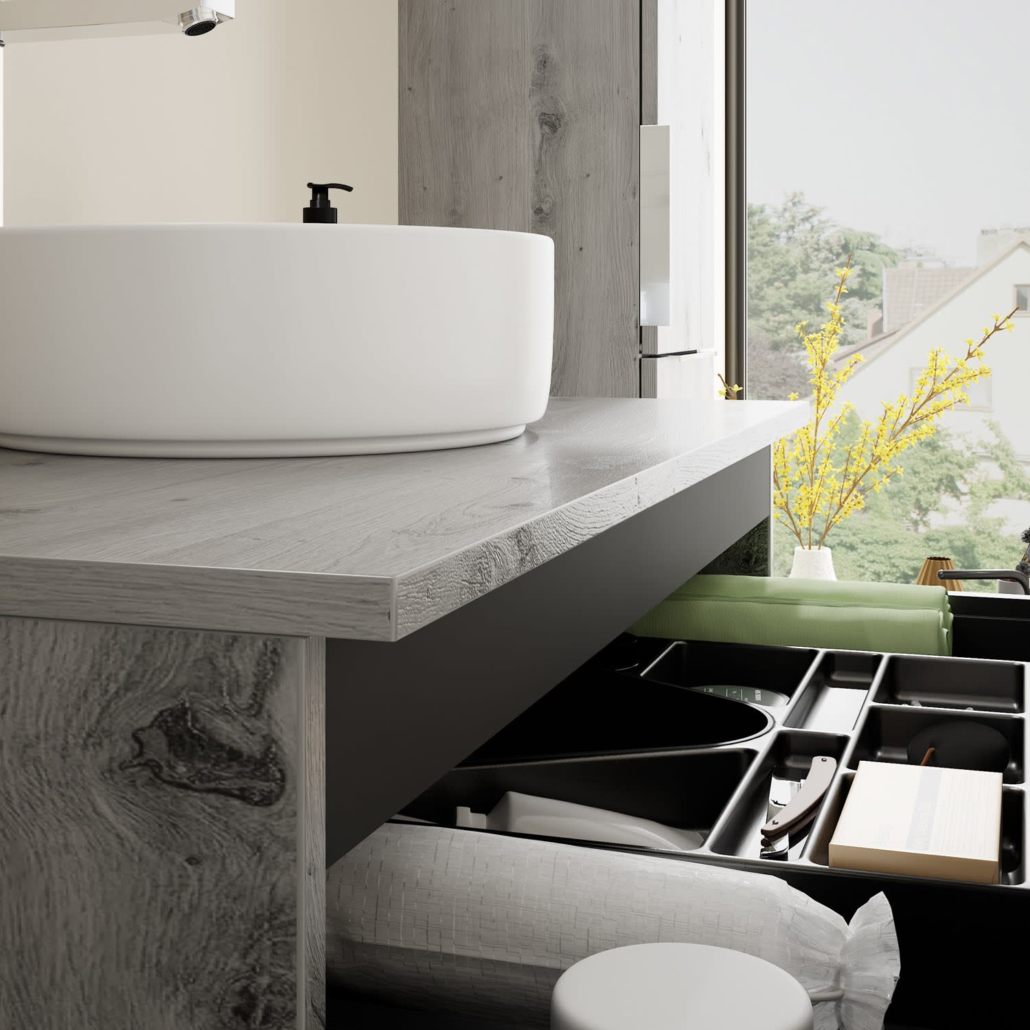 - 1 Schublade oben, 35 cm tief, mit Siphonausschnitt und Inneneinteilung
