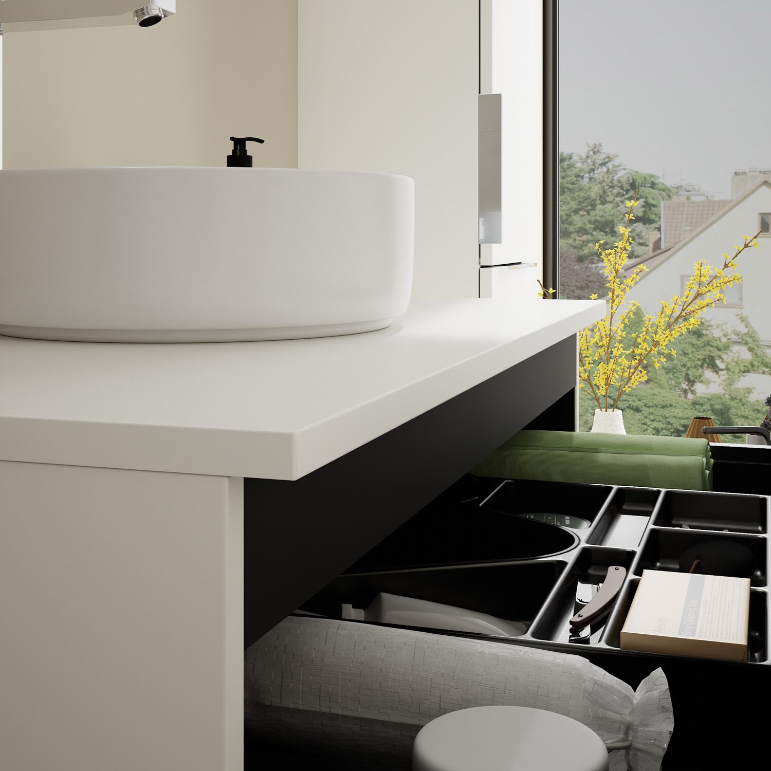 - 1 Schublade oben, 35 cm tief, mit Siphonausschnitt und Inneneinteilung