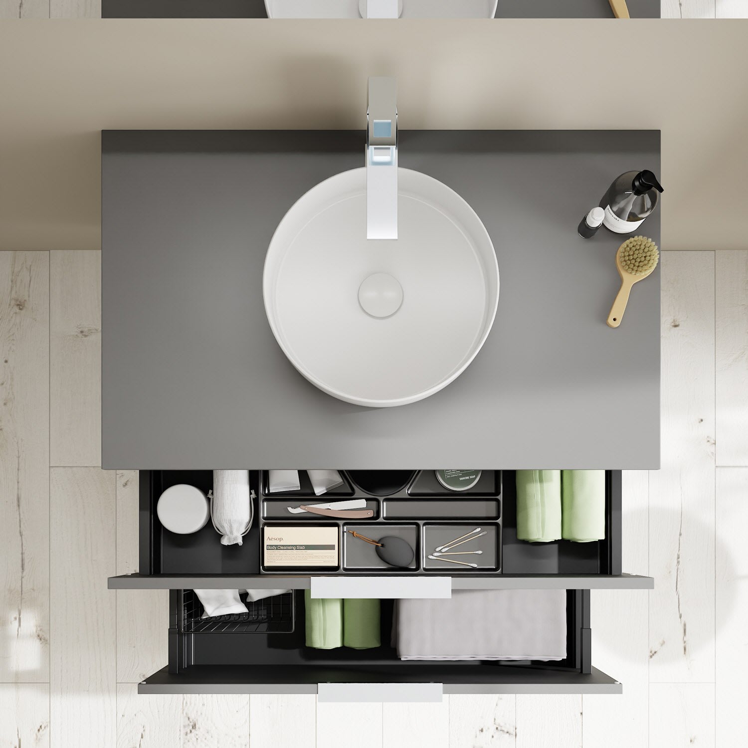 Aufsatzwaschtische müssen immer, mindestens 3 cm von den Außenkanten der Konsolenplatte entfernt sein.