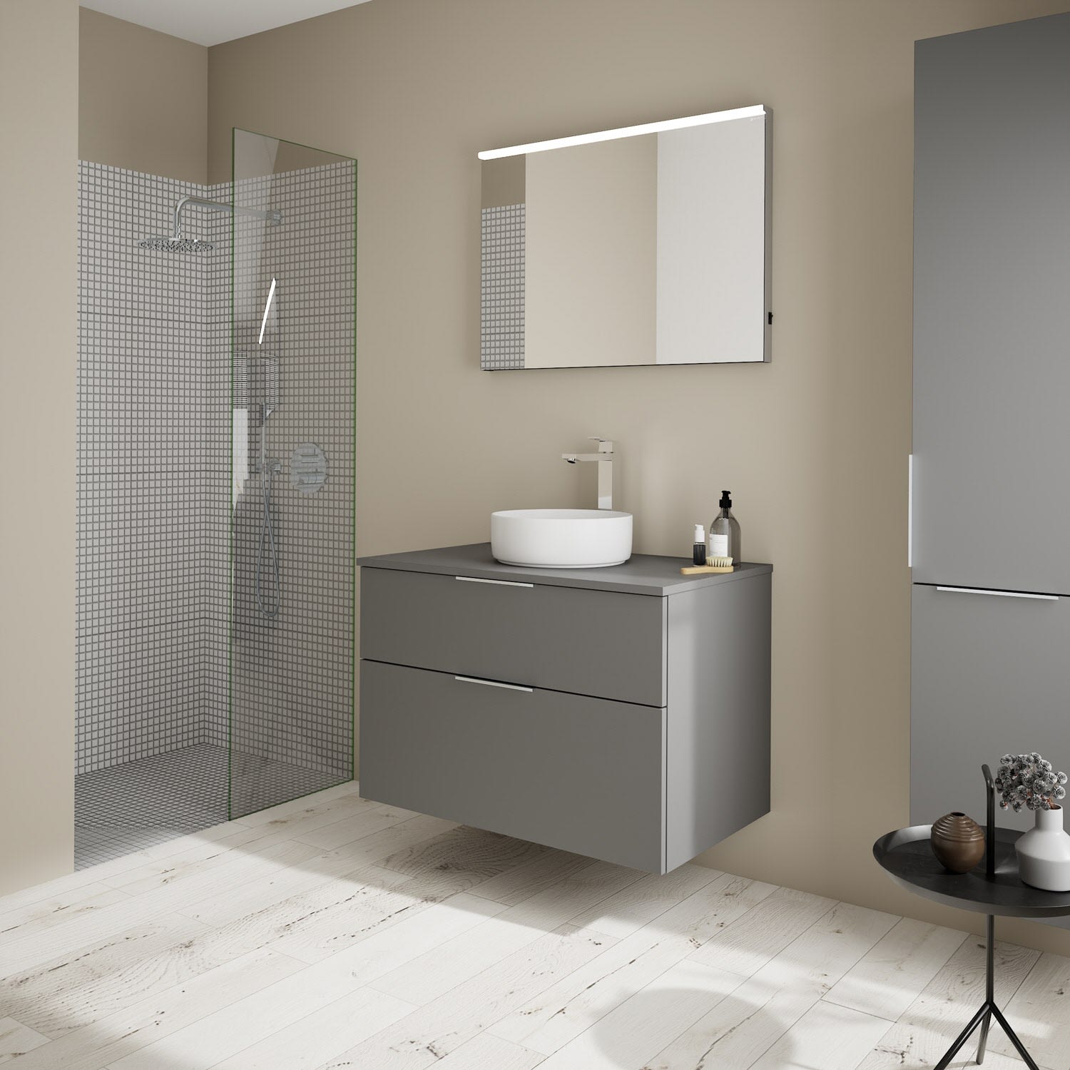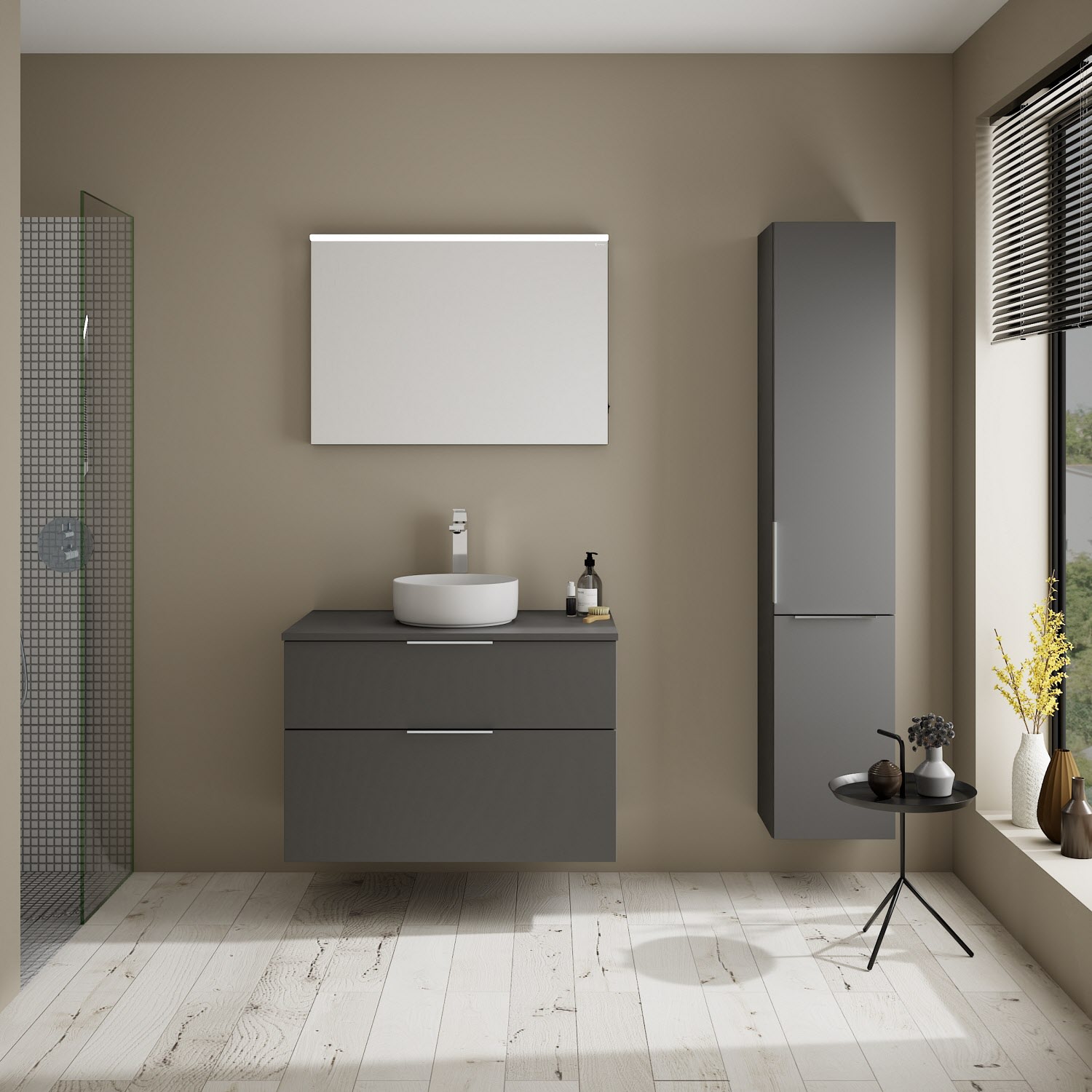 - Boden/Rückwand: Anthrazitgrau