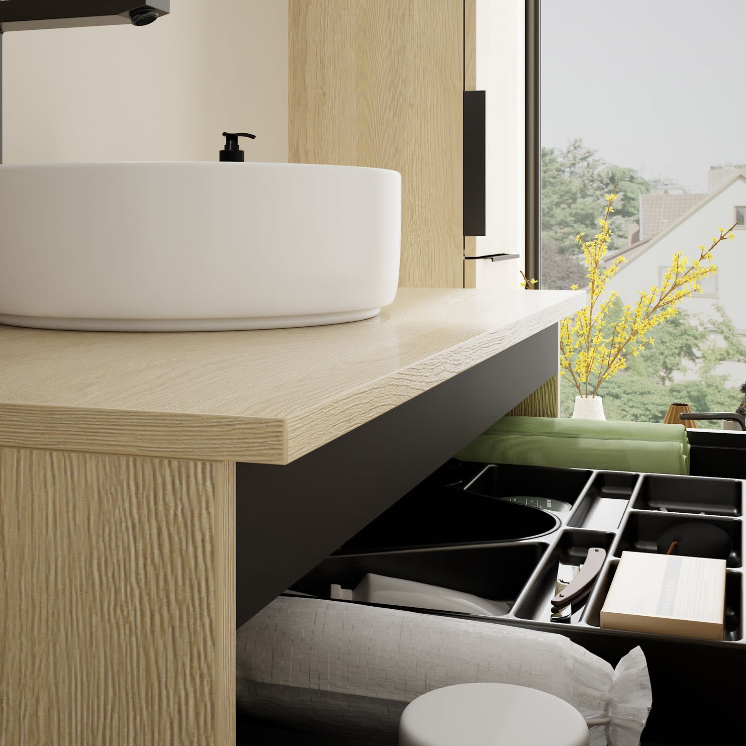 - 1 Schublade oben, 35 cm tief, mit Siphonausschnitt und Inneneinteilung