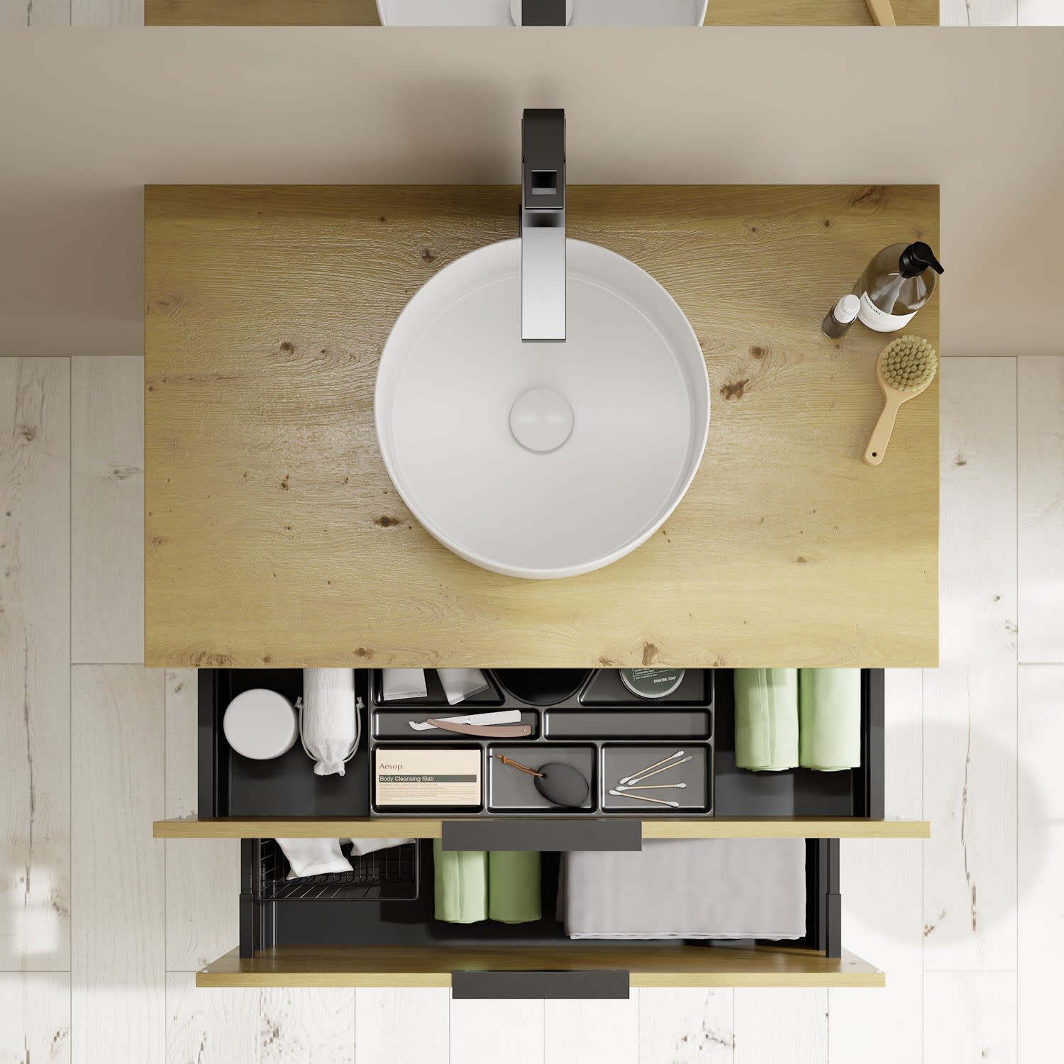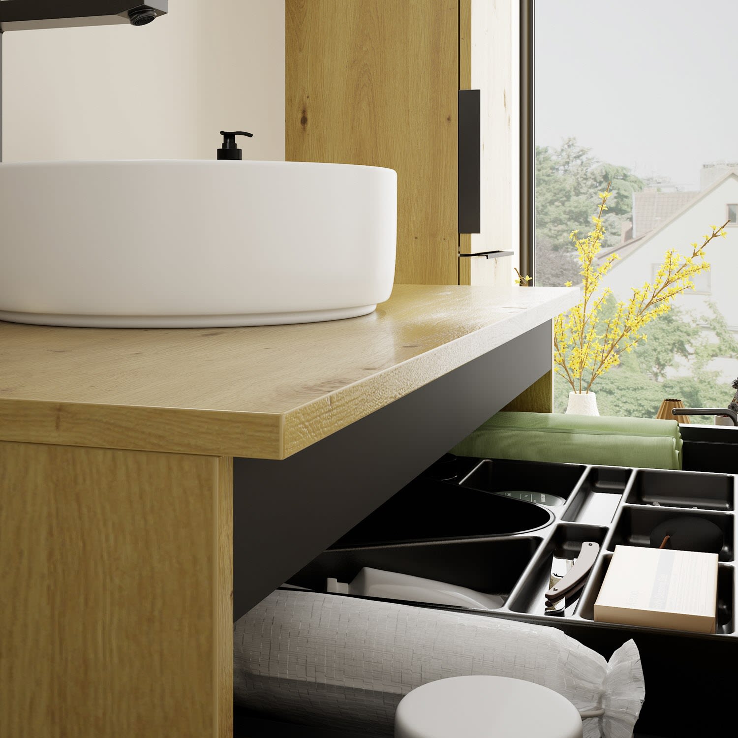 - 1 Schublade oben, 35 cm tief, mit Siphonausschnitt und Inneneinteilung