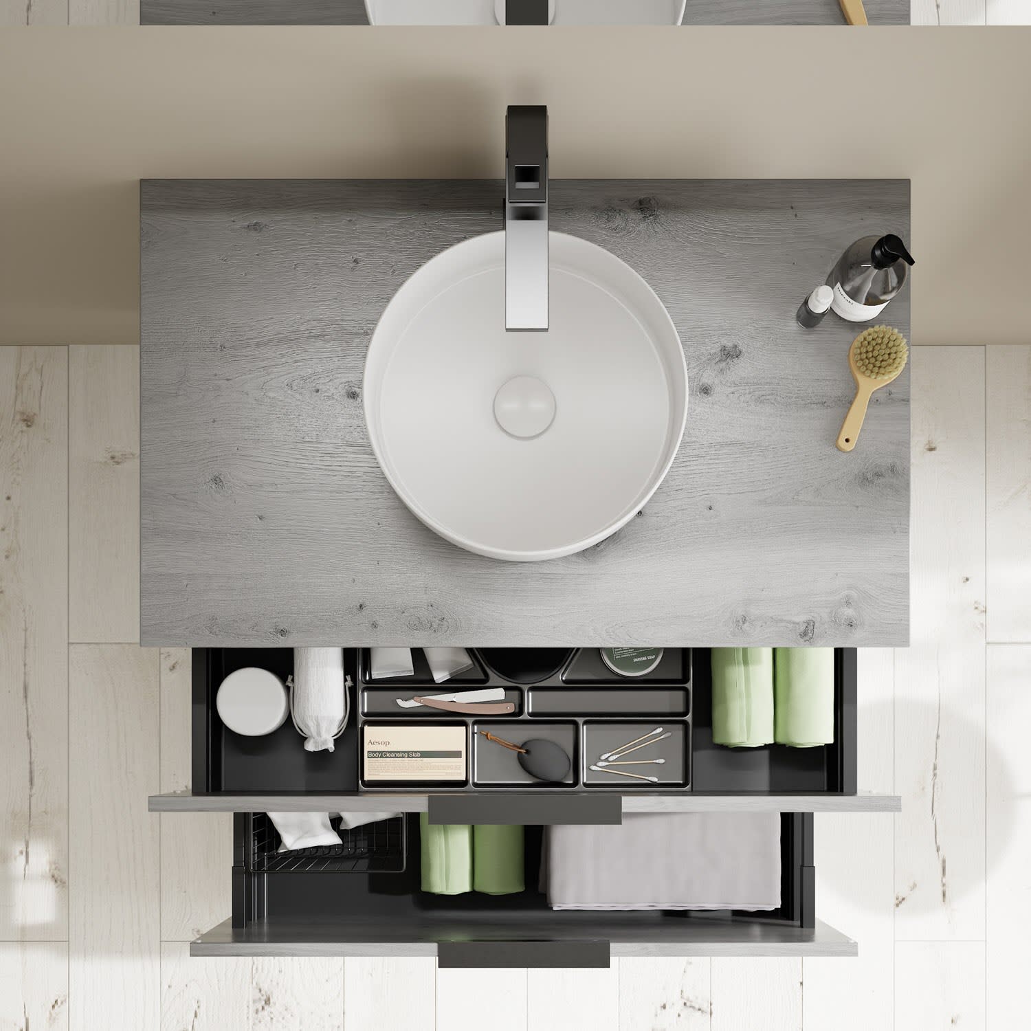 - 1 Schublade oben, 35 cm tief, mit Siphonausschnitt und Inneneinteilung
